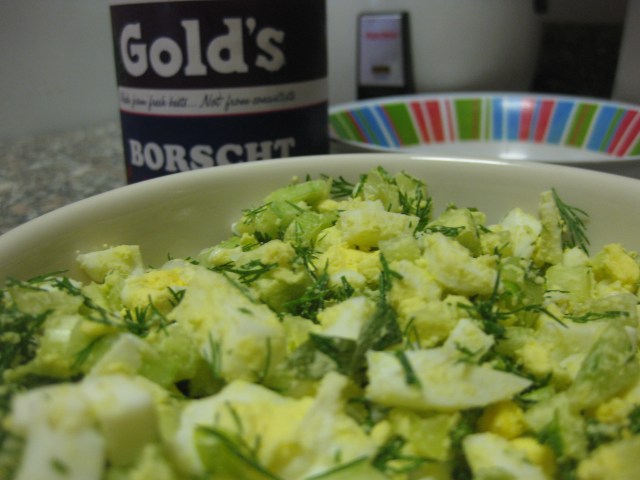 We take the easy route in preparation by buying a store bought jar of Borscht, usually you can find it in the ethnic food aisle near the kosher stuff. Not to confuse you further with the definition of “borscht” but that is what the jar says – all it is though is boiled and then shredded beets in water. However, you can easily make your own by boiling whole beets in water until they become soft. Cool the beet water and filter it using a sieve. Peel the beet and shred it. Combine the shredded beets back with the chilled beet water and store in the fridge until ready to use.