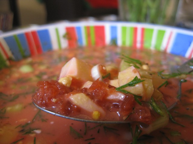 My roommate is originally from Belarus, and through her I have been able to enjoy some unique dishes from her motherland. While I like to tease that all they consume there is vodka and potatoes, Russian cuisine can be quite varied. One of my favorites is Holodnik (literally “cold soup” in Russian), which Natalya makes with beets, cucumbers, egg, dill, green onions, and sour cream. This chilled soup is light and flavorful and shockingly pink – perfect for a hot summer’s day!
