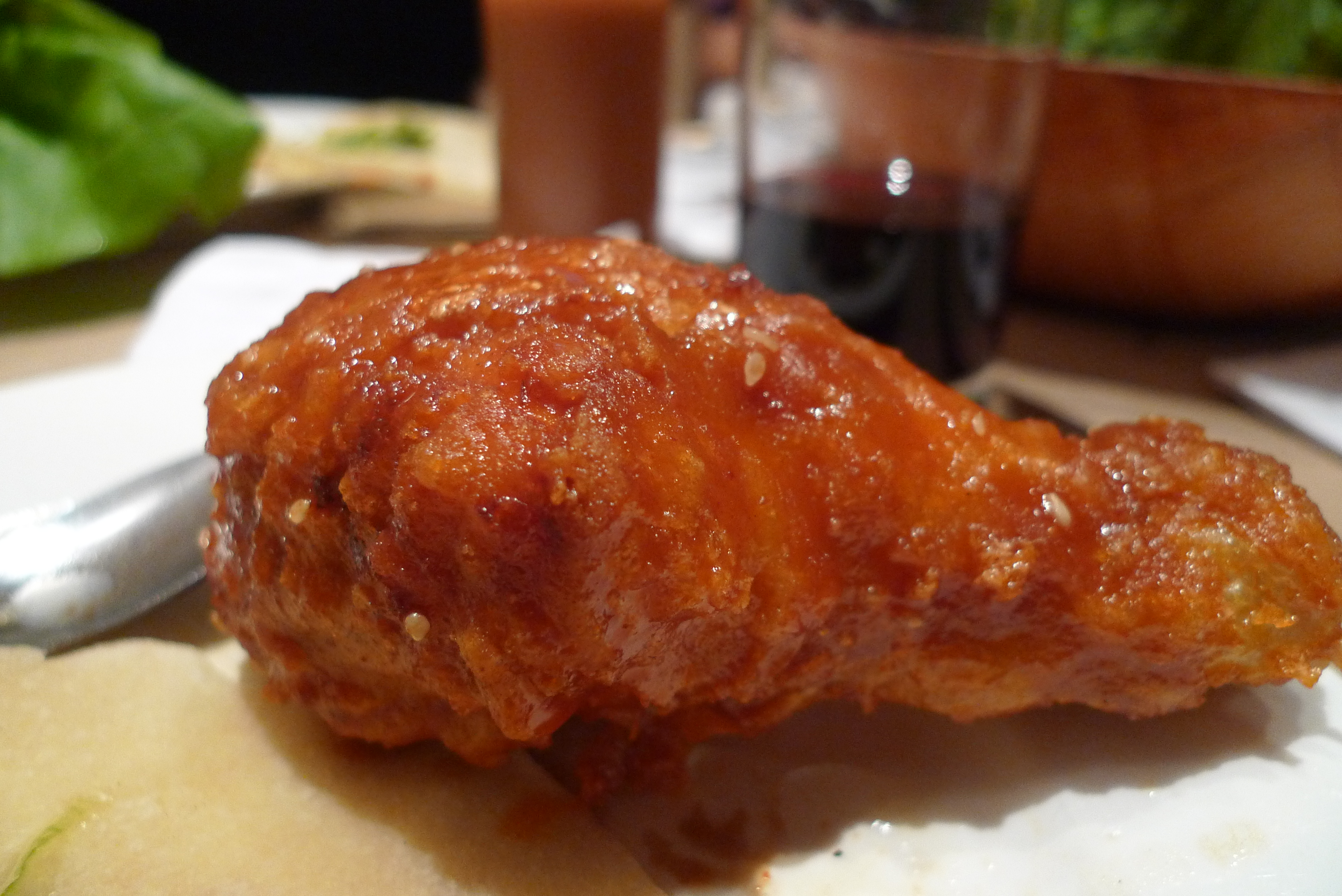 I still have dreams about the 8 lb slow roasted pork shoulder Bo Ssam dinner from Momofuku Ssäm Bar, and I was eager to try the chicken version at Noodle Bar. From the website: “The fried chicken dinner includes two whole fried chickens, one Southern style and one Korean style. The dinner comes with mu shu pancakes, long spicy peppers, baby carrots, red ball radishes, shiso leaves, bibb lettuce, four sauces and an herb basket.”