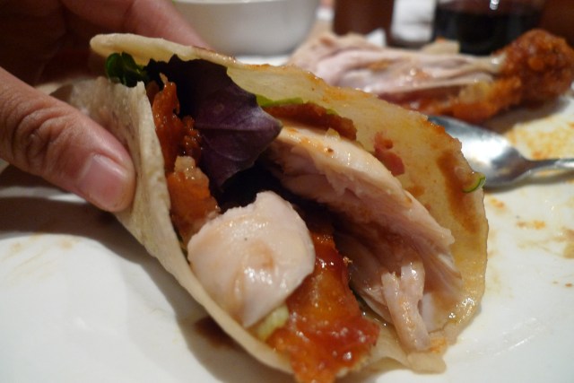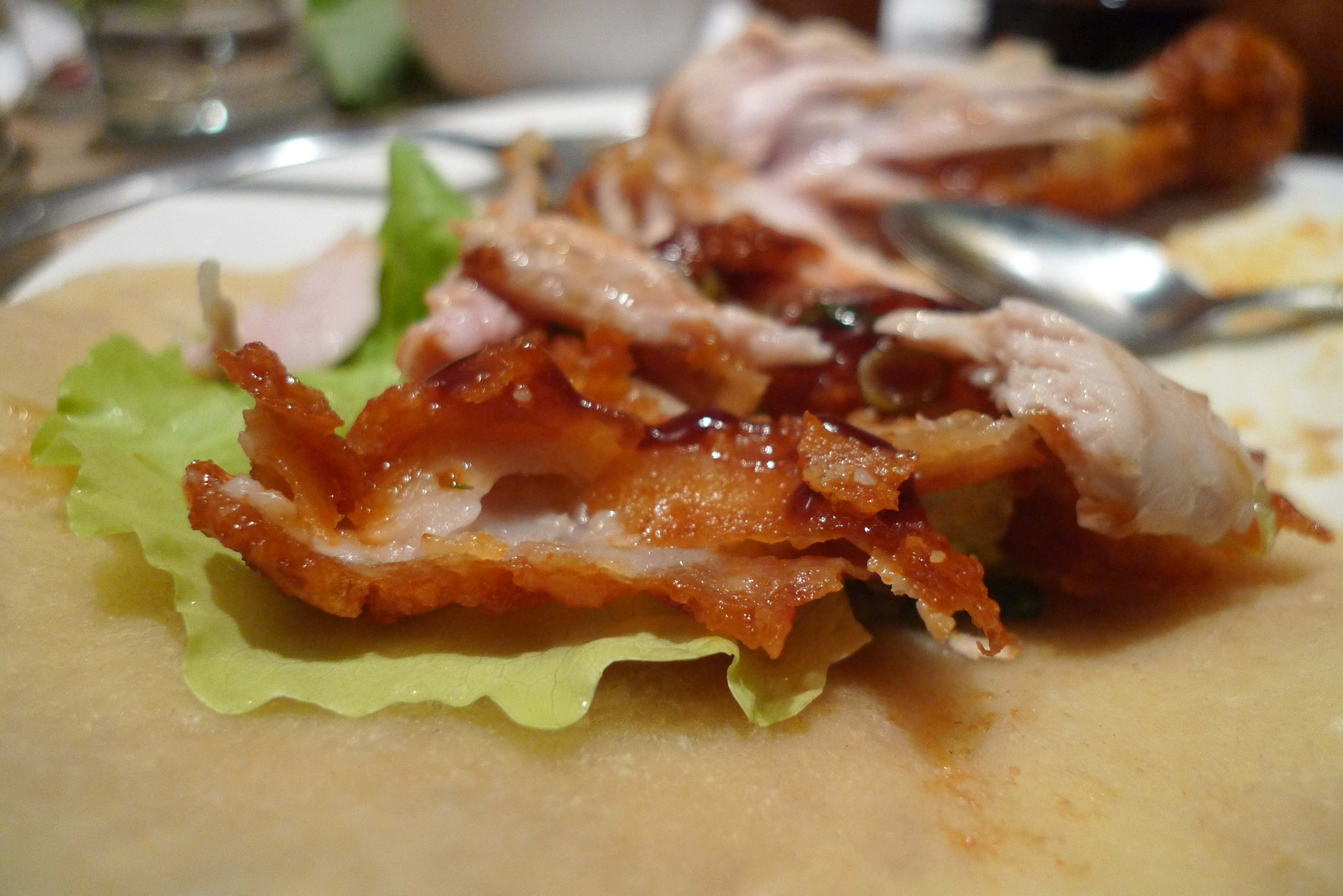 It was a wonderfully messy meal. Initially, there was the intention to use utensils but we quickly abandoned that idea and just started grabbing at the giant pile of chicken with our hands. We ate the chicken in every method possible: by itself, doused with sauce, or we shredded the meat and cripsy skin to wrap in the mu shu pancakes and lettuce.