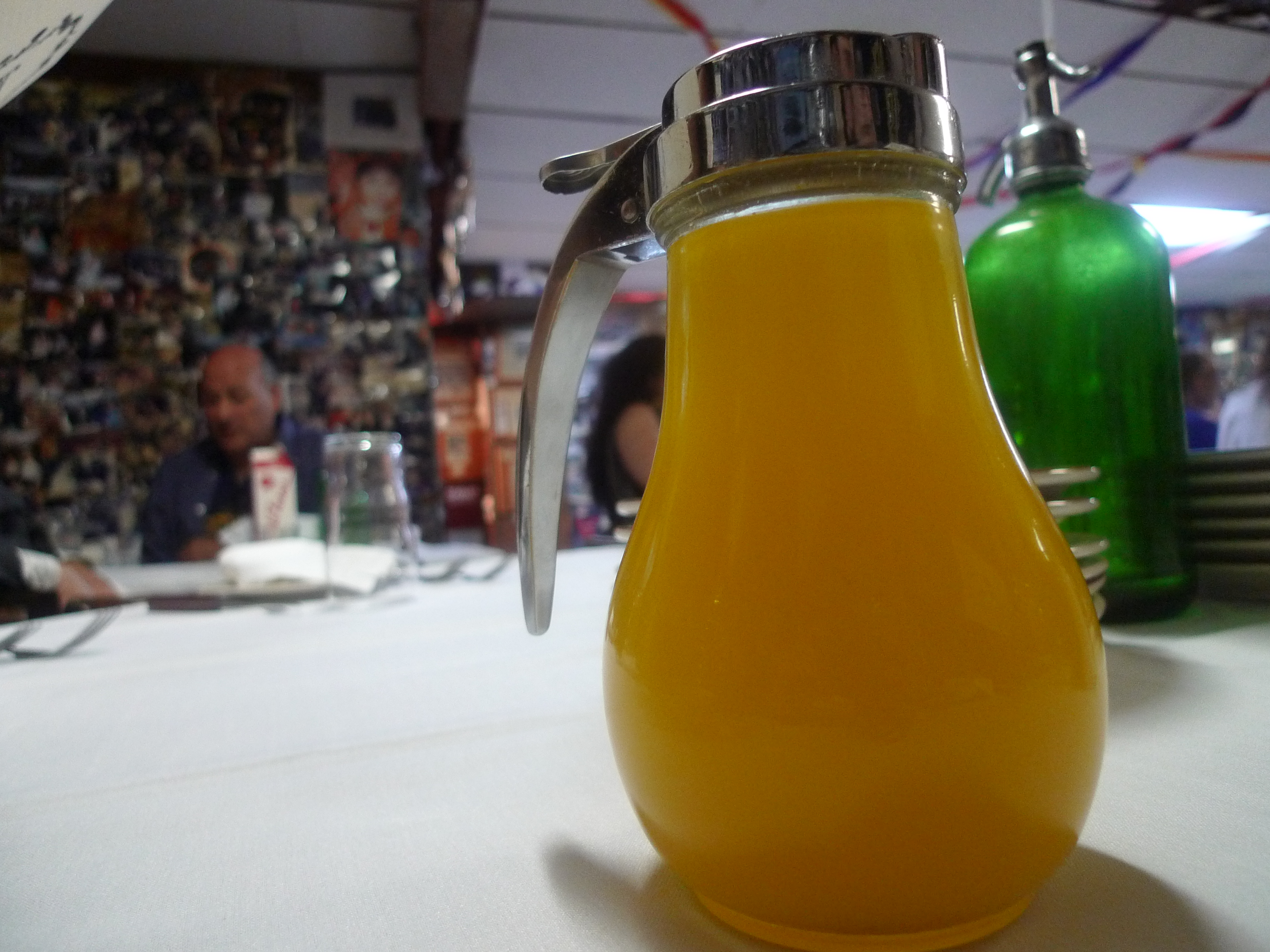 It was my friend Daniel’s birthday celebration / last night in NYC and he invited a group of 8 of us to join him at Sammy’s for the festivities. The birthday boy and his flatmate Dave were late as usual, and the rest of us decided to go inside to sit down at our table. The first thing I noticed was the syrup type bottle containing a bright yellow-orange liquid. The resident Jewish expert at the table told me it was schamltz, which is Yiddish for “orange juice.”