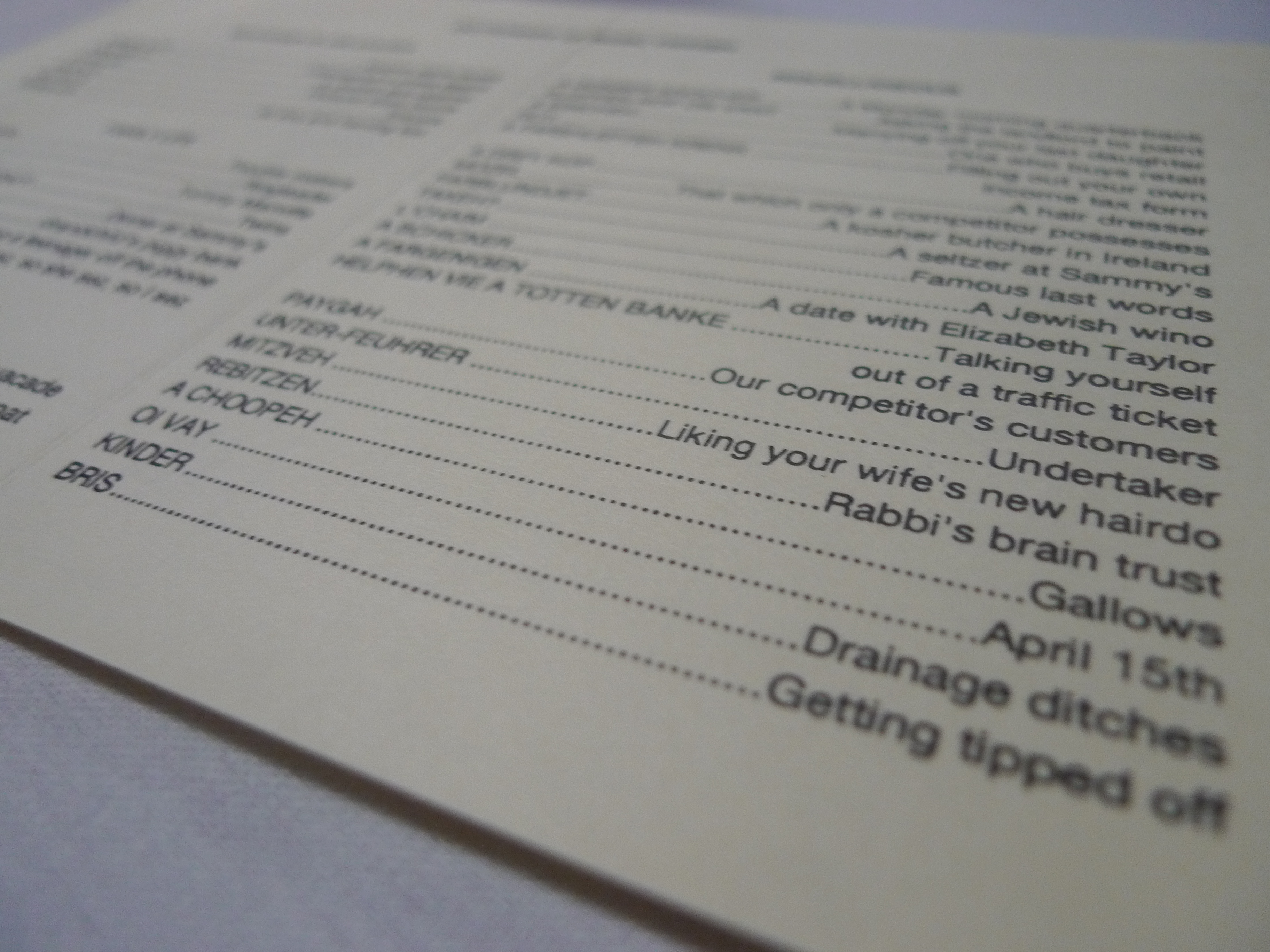 The menus were a bit ghetto as they were stapled to a manila folder and smelled of schmaltz. On the table were also cards containing “Useful Yiddish Phrases,” although after saying a few to my Jewish friends, I found the phrases and their “literal” translations were not so useful at all.