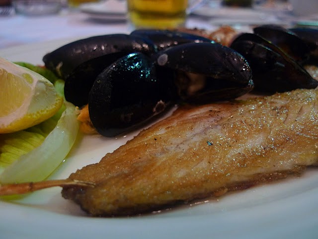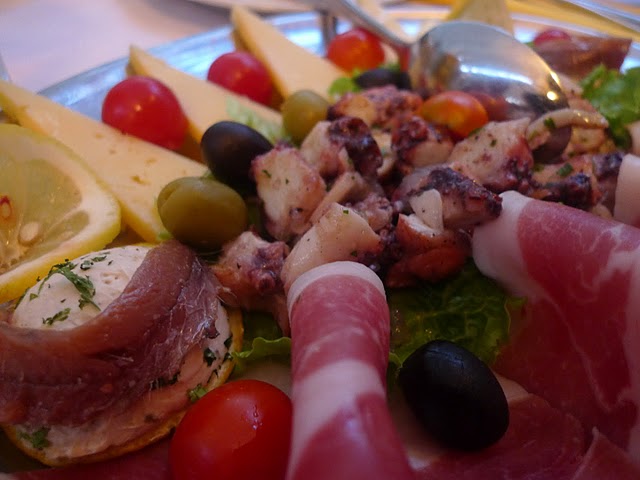 After wandering the labyrinthine alleys of Diocletian’s Palace, our group stopped at Gradska Havana (Town Tavern), which was the first restaurant we found with a decent menu and had enough space to seat all 10 of us. After the perfunctory round of Karlovačko, Jen and I ordered the cold appetizer plate and the seafood platter to share. The cold appetizer plate consisted of Dalmatian Pršut (a double-smoked ham similar to Italian prosciutto), fish pâté wrapped in anchovies, grilled octopus, cheese, and was garnished with cherry tomatoes and olives. The fish pâté was refreshingly light and citrus-y; a pleasant surprise to us gluttons who are used to gobs of pâté smothered in oil. The salty, smoky pršut was well complemented by the smoother-tasting cheese. The seafood platter included freshly grilled fish, mussels, and scampi which were all cooked to perfection. I typically scoff at food that requires work (deboning fish, shelling mussels and scampi), but this was well worth the effort!