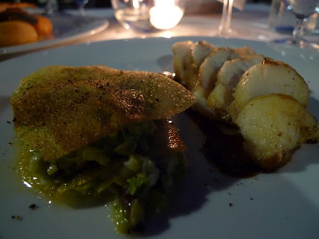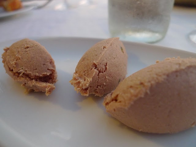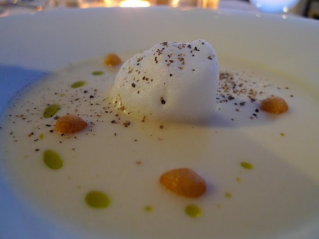 Our amuse-bouche was tuna pâté. By then we had fallen in love with seafood pâtés and devoured it immediately. I started with a grilled octopus salad on a bed of pita, goat cheese and arugula. Grilled octopus might now be in my top 5 favorite appetizers. When prepared skillfully, it is soft, flavorful and not at all chewy. Jen was a bit under the weather so she started with a white tomato essence soup with truffle foam. It was light, yet rich and savory.