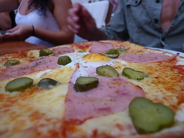 In Korcula, we headed to a pizzeria for a group dinner. The 29 of us took up the entirety of Cazenezzo’s outdoor patio, so we could be as rowdy as we wanted. We started with a bottle of chilled Plavac Blato wine from a local winery. It was refreshing, but it was odd to imbibe a chilled red. We all concurred that it would have tasted a lot better with a bit of fruit and soda water, i.e. as sangria. Jen had a calzone pizza with cheese, tomato, mushrooms, and olives. I had a pršut pizza with ham (obviously), cheese, and garlic cloves (heaven!). Several guys ordered a pizza with ham, pickles, and a fried egg on top which seemed like an awkward combination, but definitely worked.