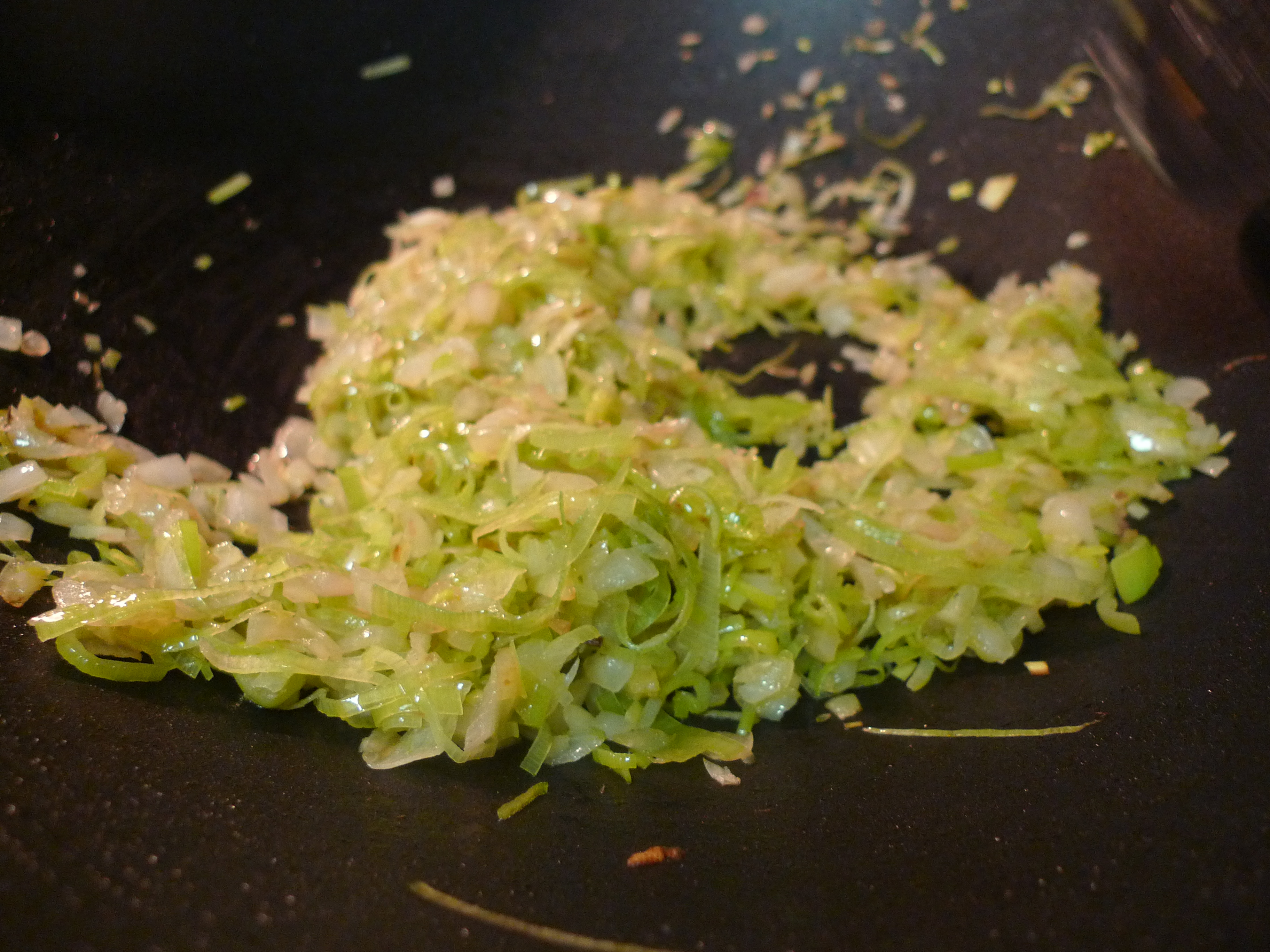 Add 1 T olive oil to the pan and stir in the garlic, leeks, shallots, and onions. Sauté until the onions are translucent, about 1 minute.