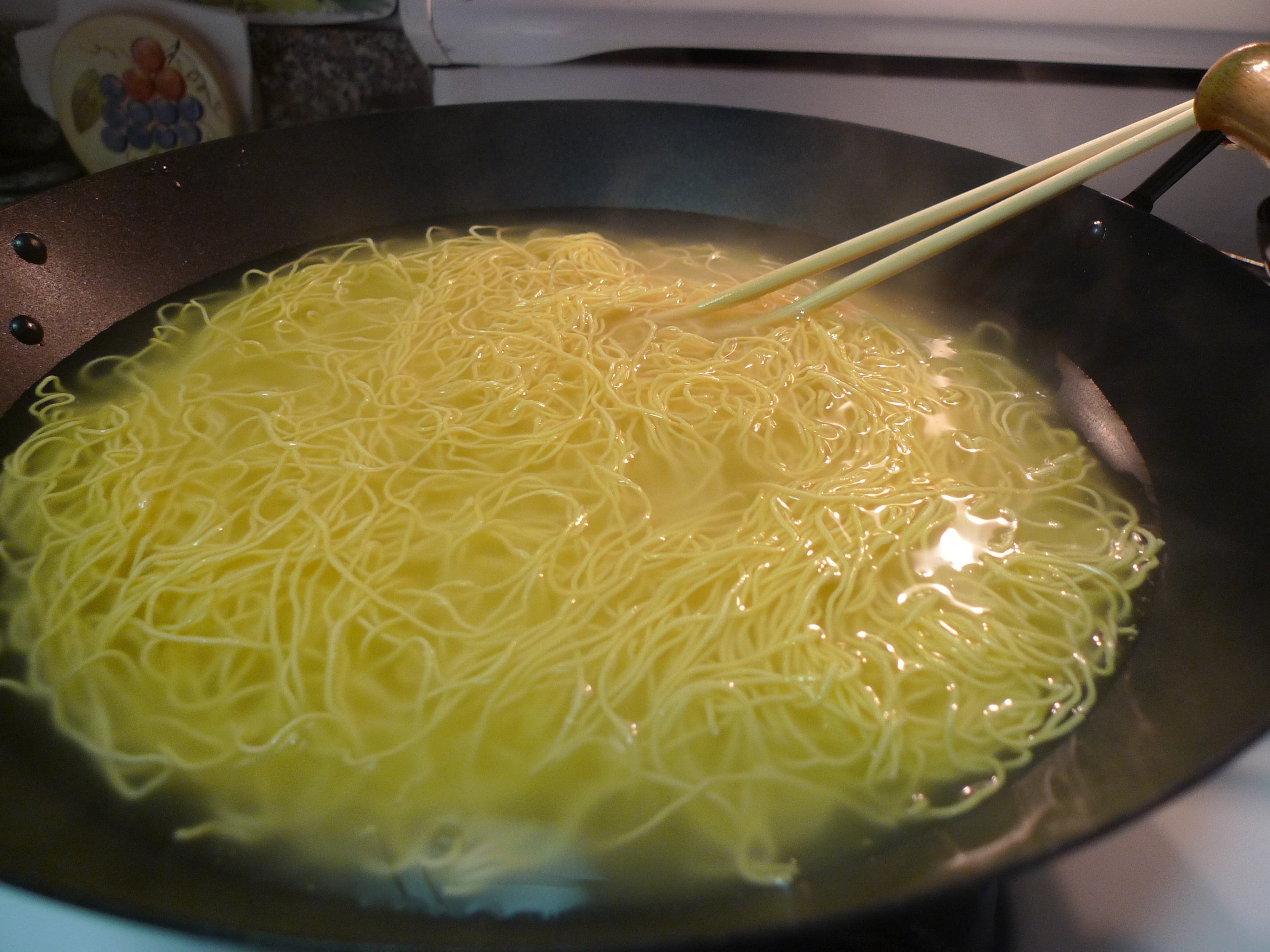Heat 1 T cooking oil in a large skillet. Place a thin layer of noodles in the pan just to cover the bottom, but do not overcrowd. Let sit for a couple minutes until the bottom of the noodles are golden, and then flip the noodles over to pan fry the other side.