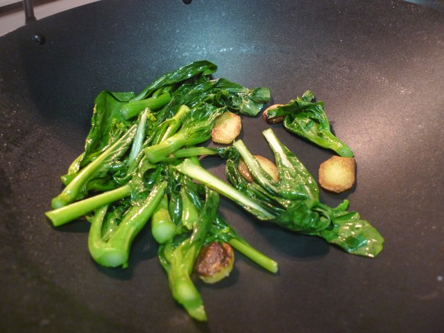 In a large wok, heat 1 T of cooking oil. Add 2 cloves of whole garlic and 3 coins of ginger to the wok. When the garlic is browned, add your choice of Chinese vegetables (Gau Choy, Gai Lan, or Boy Choy) and stir fry for a couple minutes.
