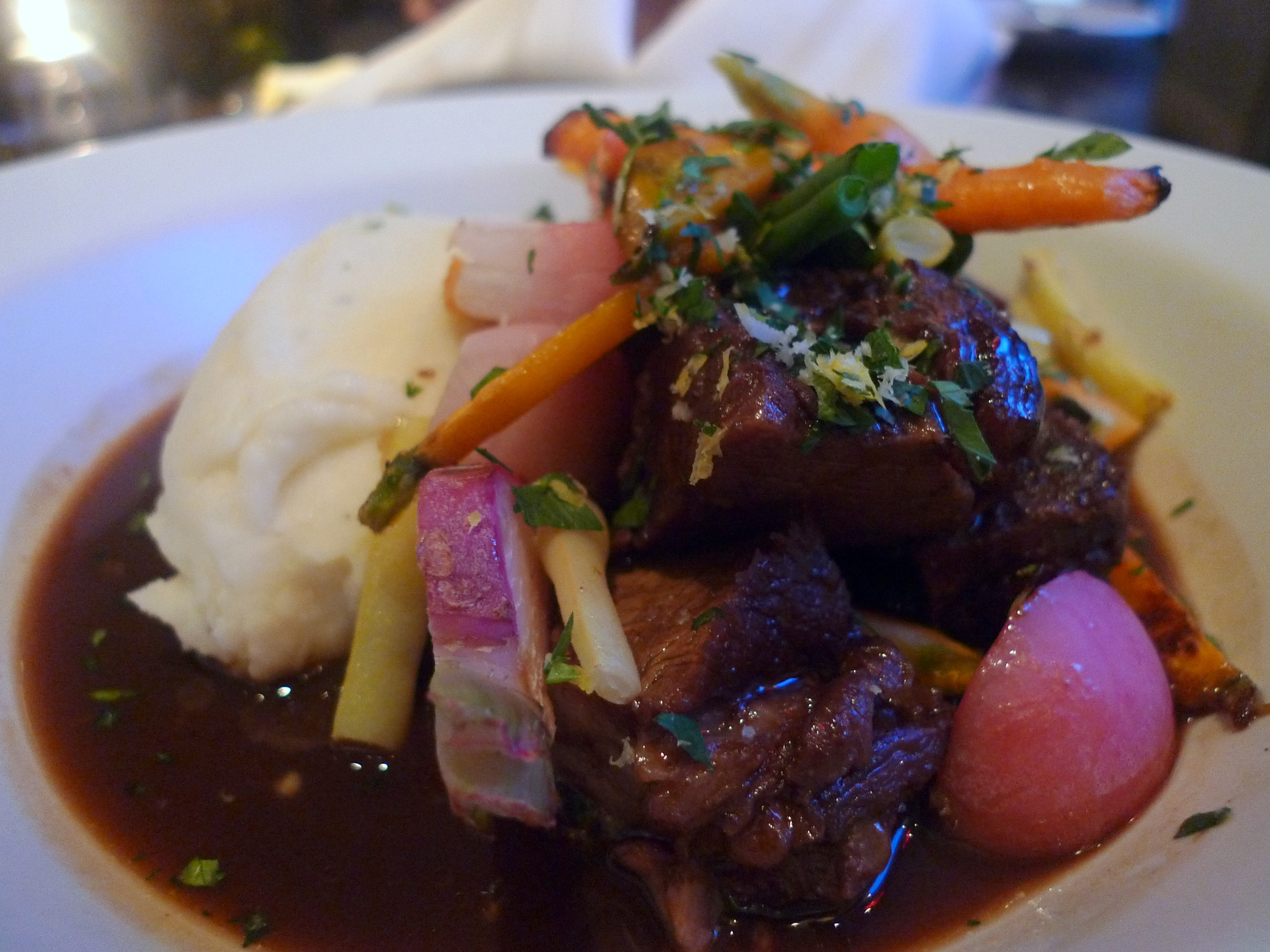 Braised Short Ribs, Mashed Potatoes, Thumbelina Carrots, Radishes, Green Beans, Gremolata