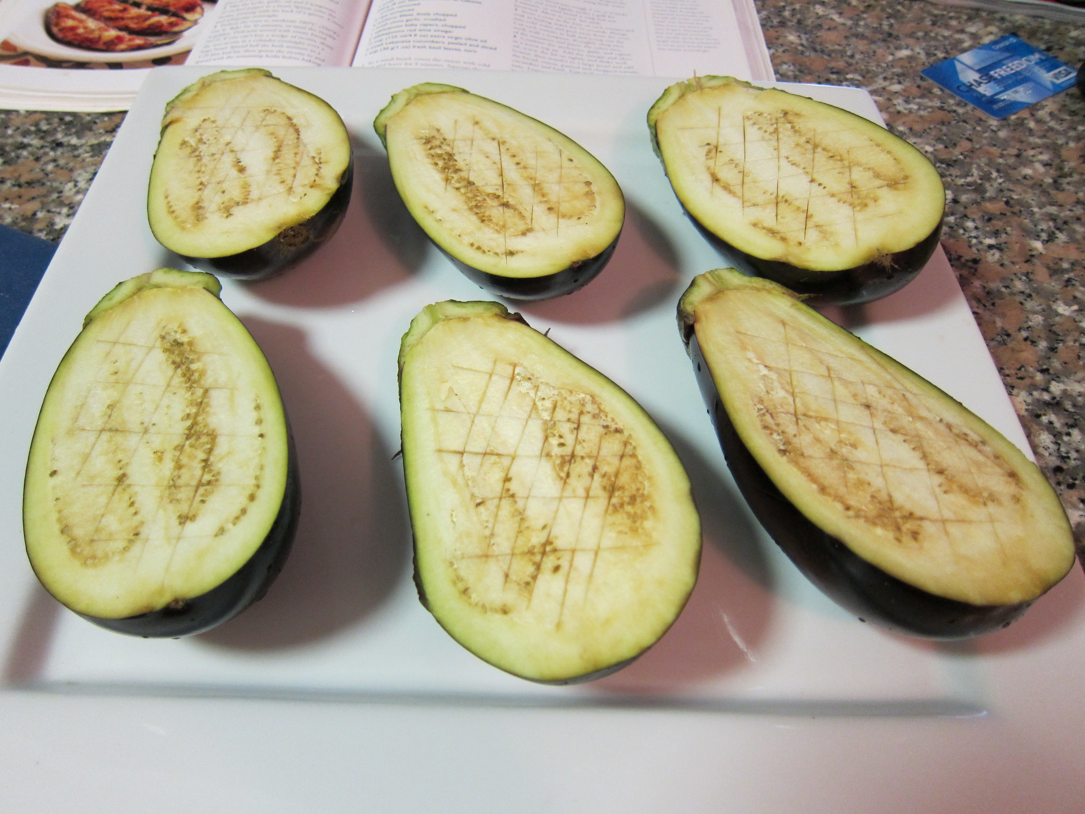 Preheat the oven to moderate 350 degrees Fahrenheit. Score eggplant flesh by cutting a criss cross pattern with a sharp knife, being careful to not cut through the skin. Make the criss crosses close together, that will help later on when you have to scoop the insides out.
