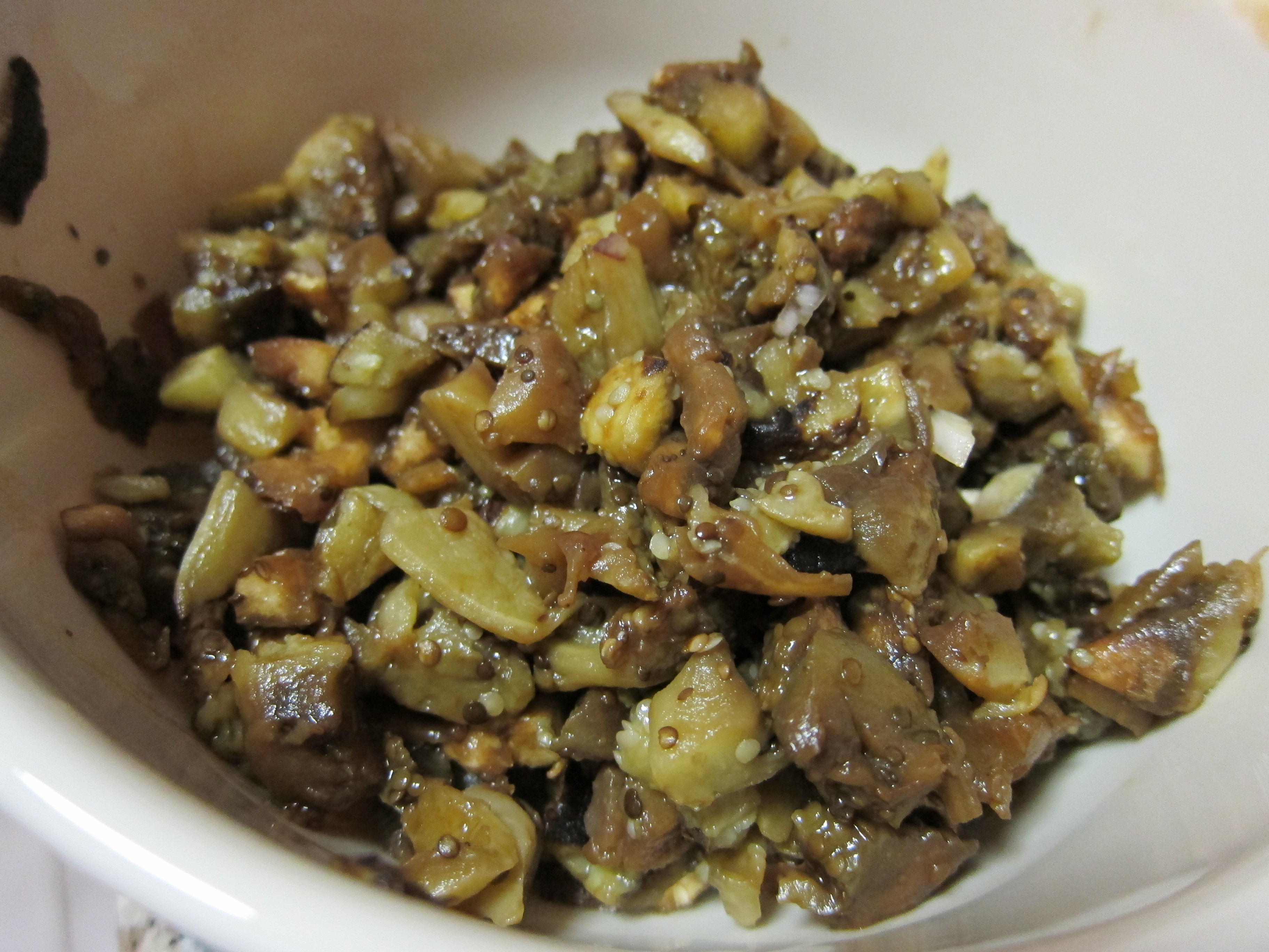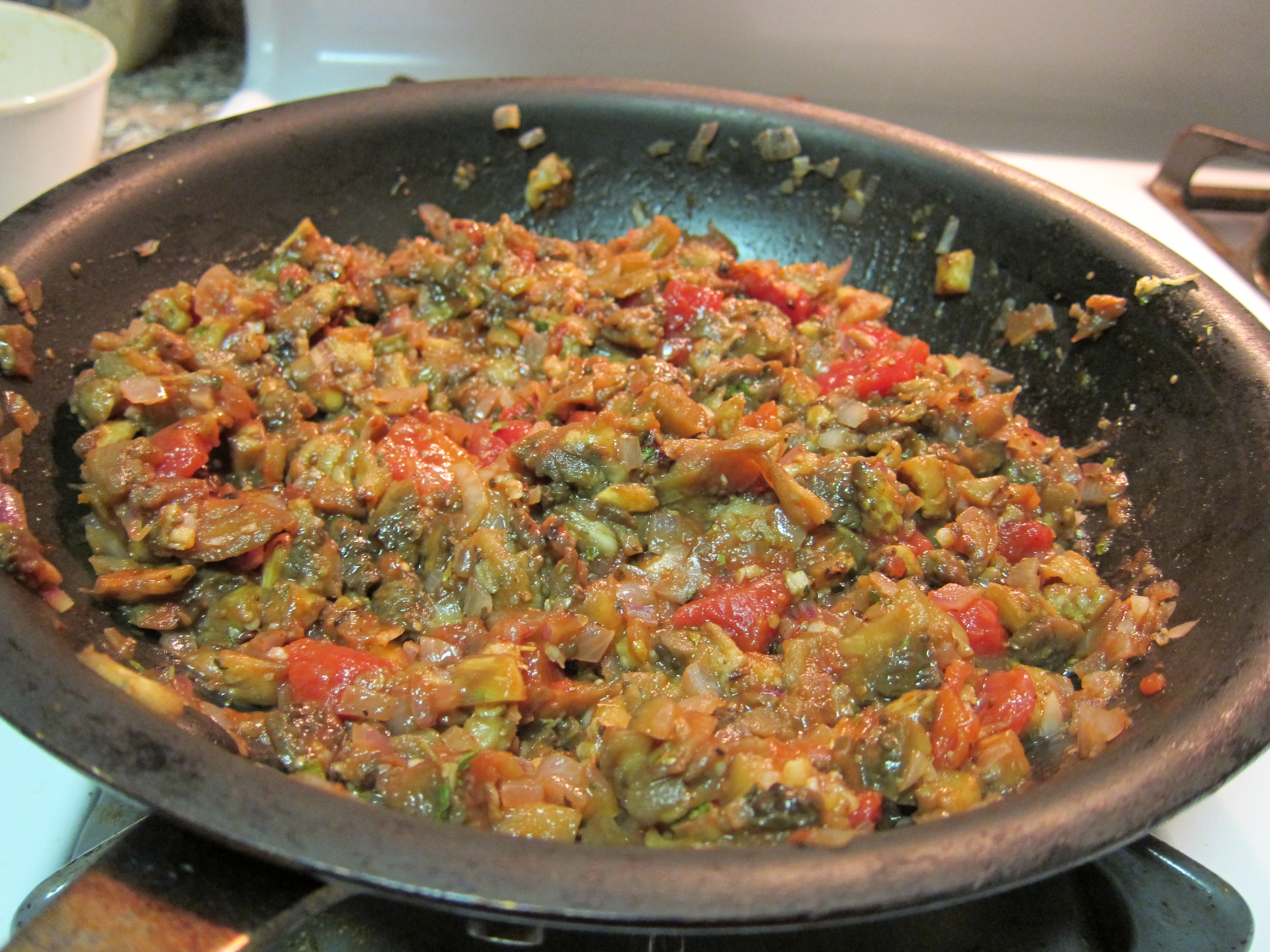 Heat 2 tablespoons oil in a large frying pan, add 3 eggplants and cook for 2-3 minutes or until flesh is soft. (I actually cooked for longer, which made the flesh easier to scoop out later). Remove and repeat with another 2 tablespoons of oil and the remaining eggplants.