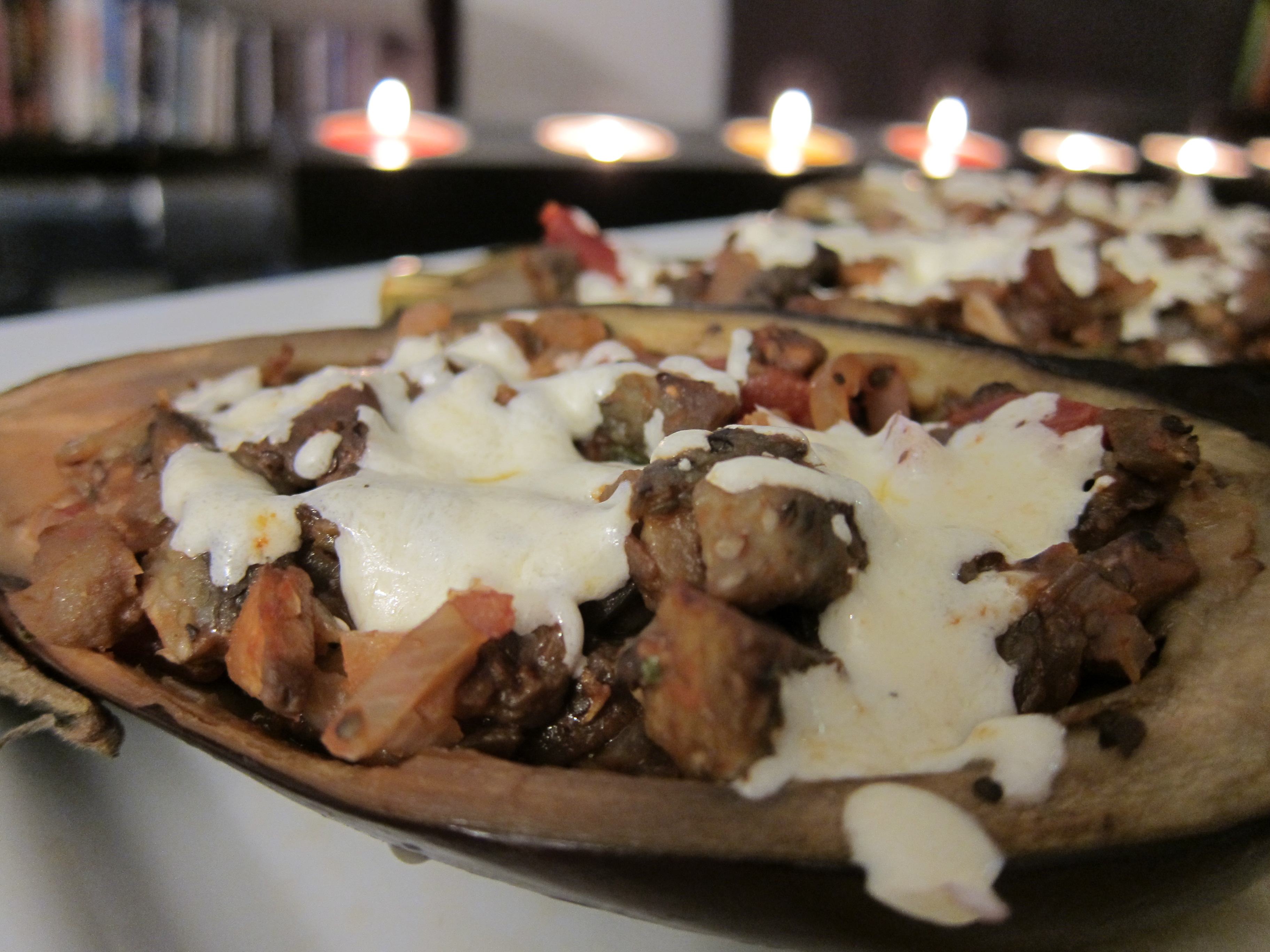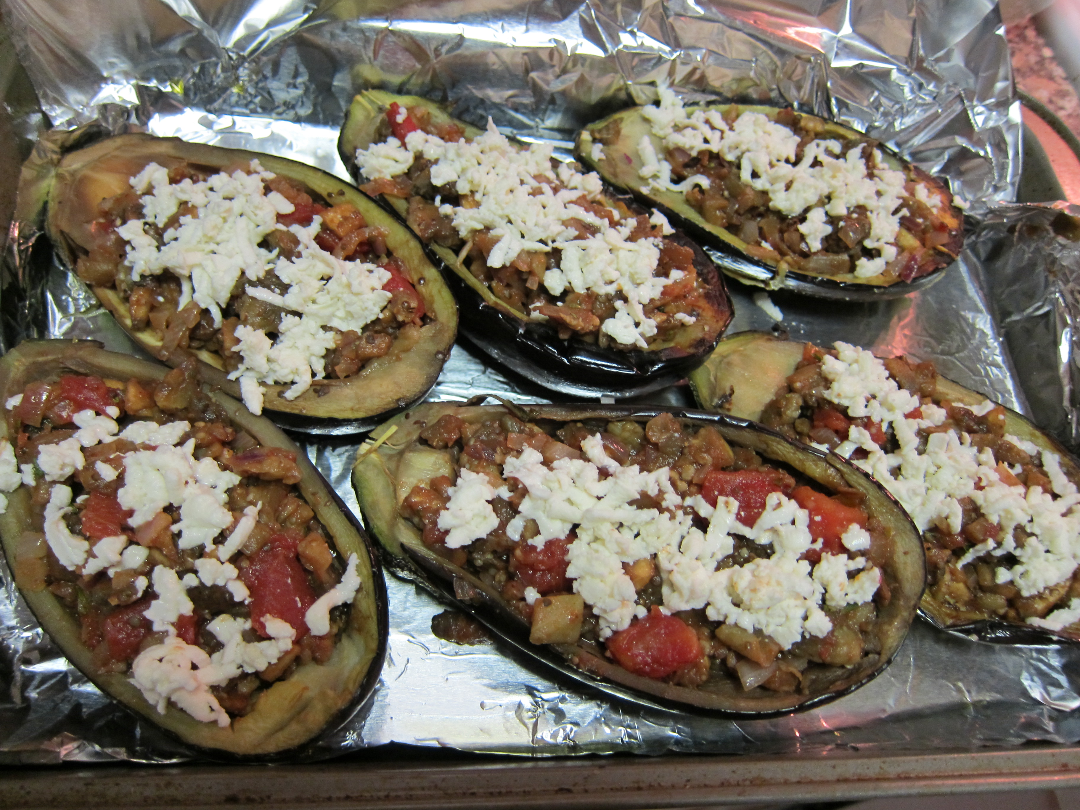 Arrange the eggplant shells in a lightly greased baking dish and spoon in the tomato filling. Sprinkle with mozzarella and bake for 5-10 minutes, or until the cheese has melted.
