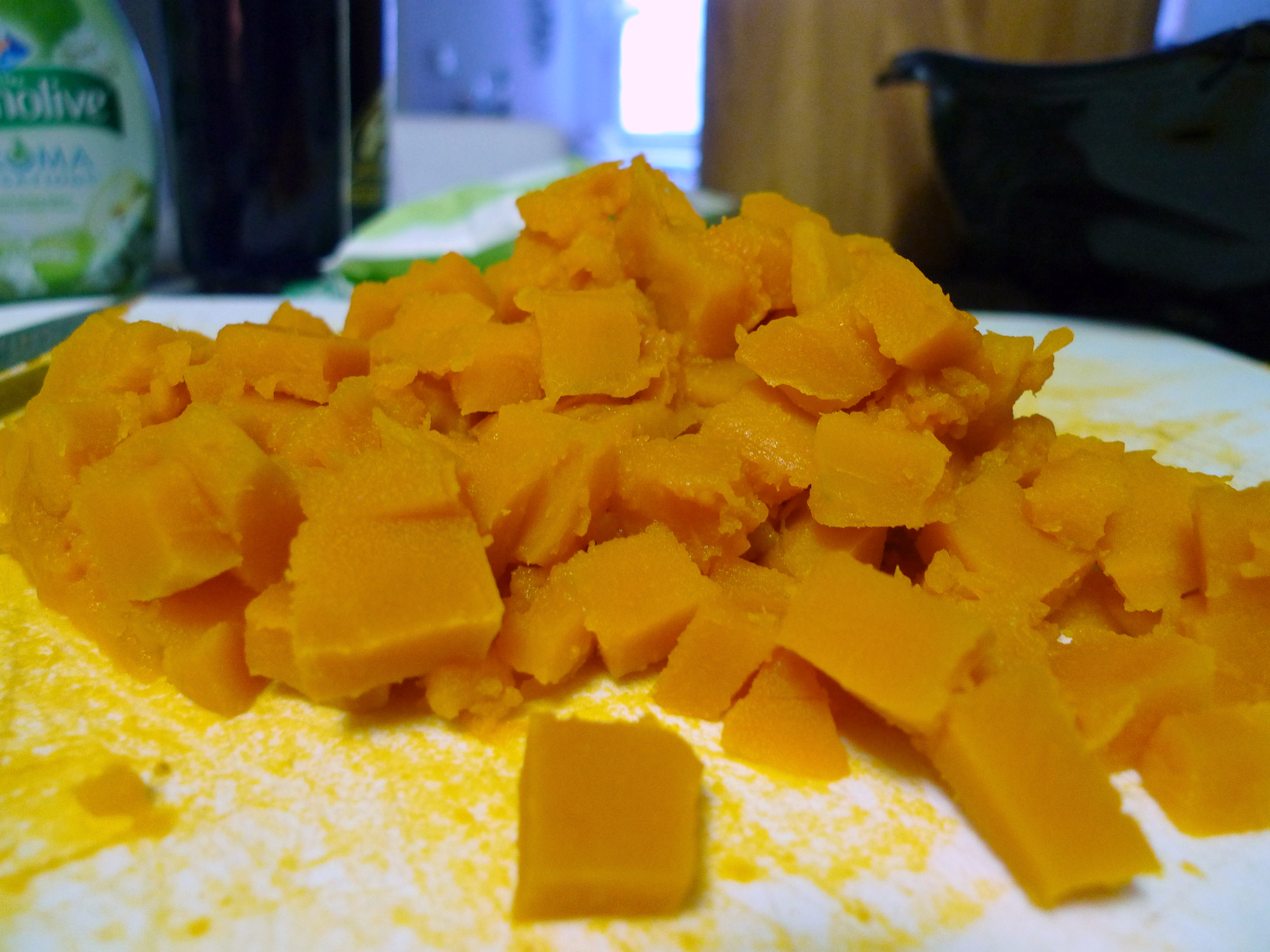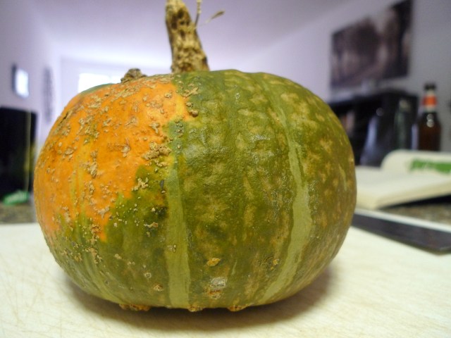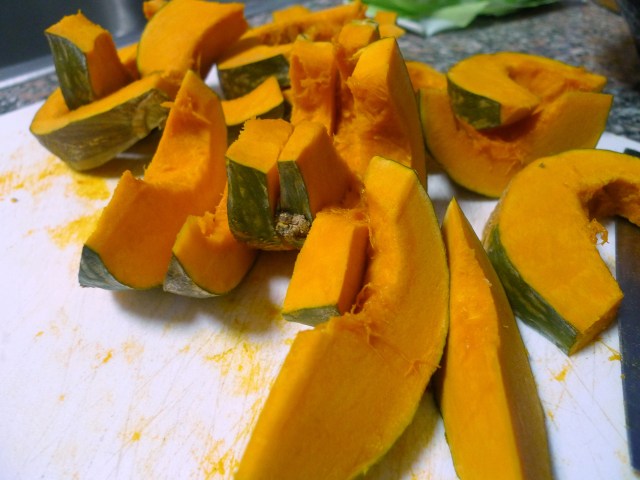 When I went to the grocery store, I decided to buy butternut squash instead of a pumpkin.  However, I actually had no idea what butternut squash looked like and ended up grabbing the first item off the squash table… which I later discovered to be Kabocha squash, which is a Japanese varietal of buttercup squash.  Confused?  I was!  There are tons of varieties of squash (pumpkins included) but essentially the squash we associate with the autumn season are winter squash.  Winter squash differ from summer squash in that it is harvested and eaten in the mature fruit stage, when the seeds within have matured fully and the skin has hardened into a tough rind.  Kabocha squash is commonly called Japanese pumpkin and has a sweet, moist flavor reminiscent of chestnuts.