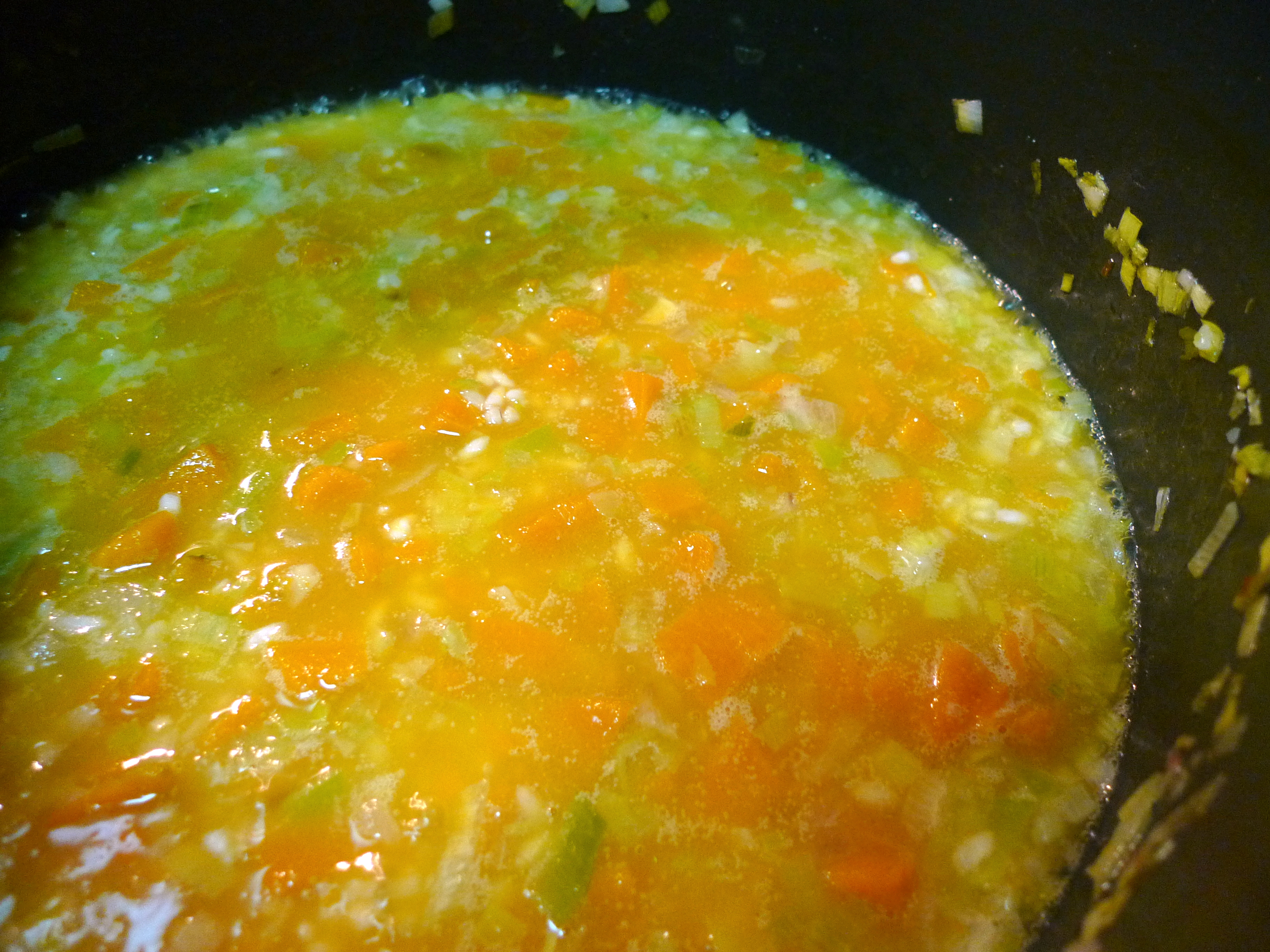 Add the rice, the diced squash and the broth to the pot.  Bring to a boil over high heat, cover, reduce heat to low and cook for 15 to 18 minutes, or until the rice absorbed the broth.