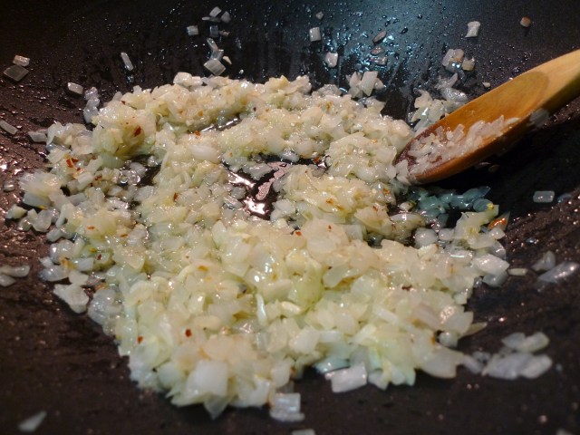 Heat the olive oil in a saucepan, add the onion and cook over medium heat for 5 minutes. Add the garlic and chili flakes to the saucepan and cook for 30 seconds.