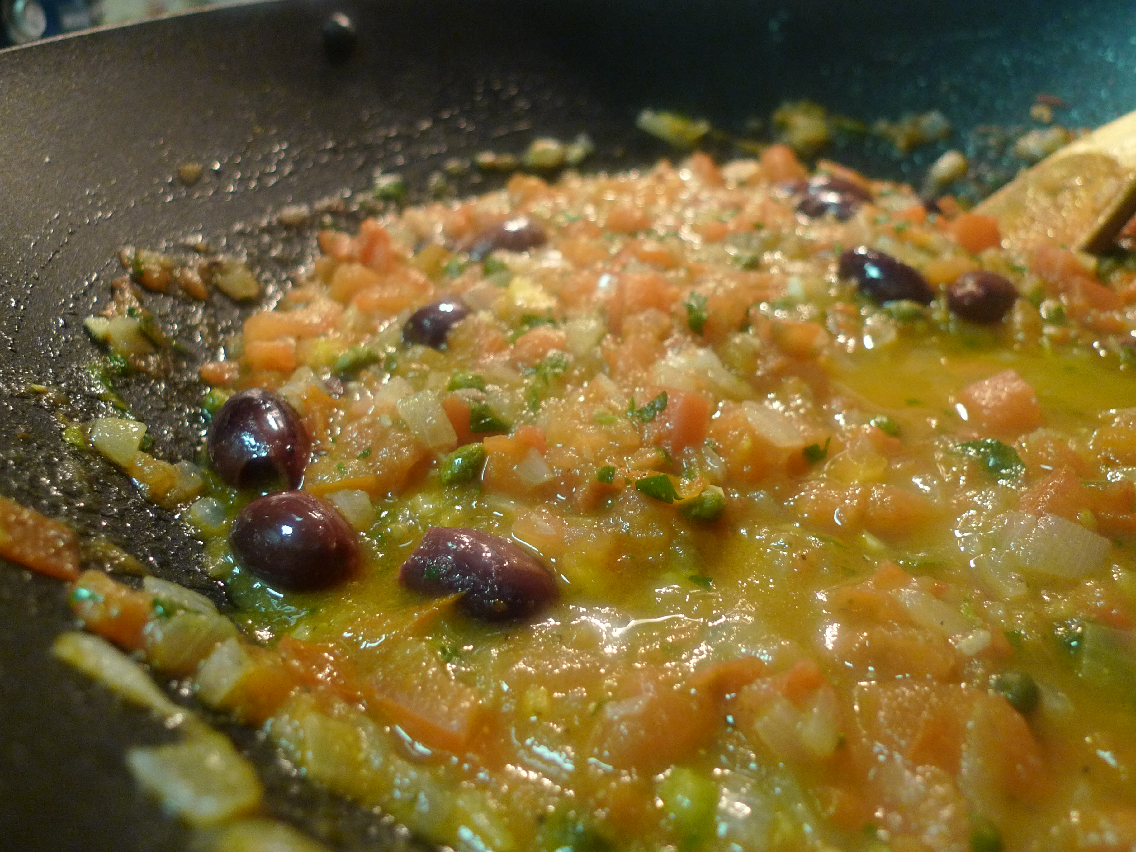 Add the tomato, capers and anchovies. Simmer over low heat for 10-15 minutes, or until the sauce is thick and pulpy. Stir the olives and parsley through the sauce.
