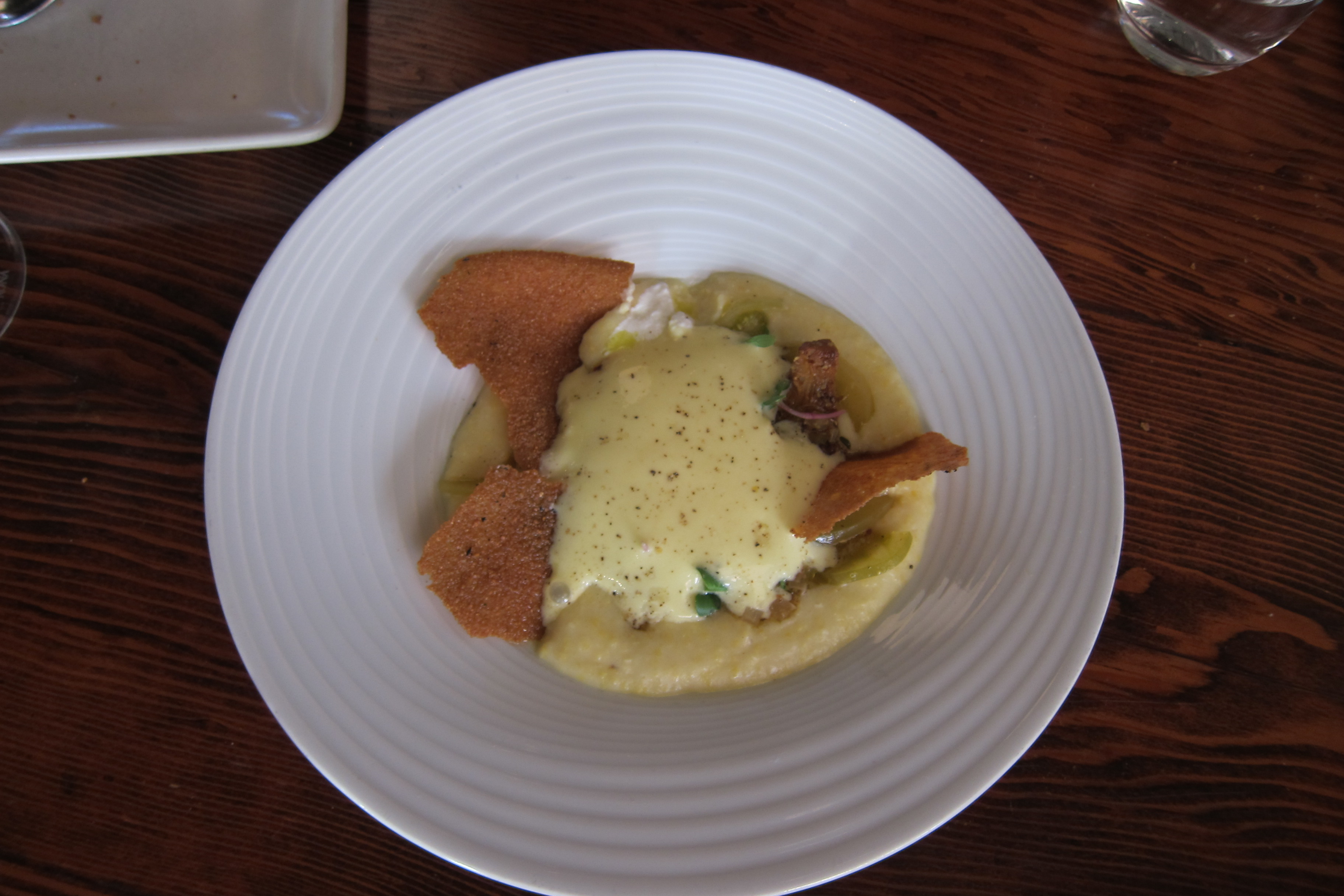 Organix arbuckle grits, whipped chicken EGG, and crispy “skin”, with goat’s milk ricotta, HONG VIT, “chanterelle” and GREEN TOMATO chow chow