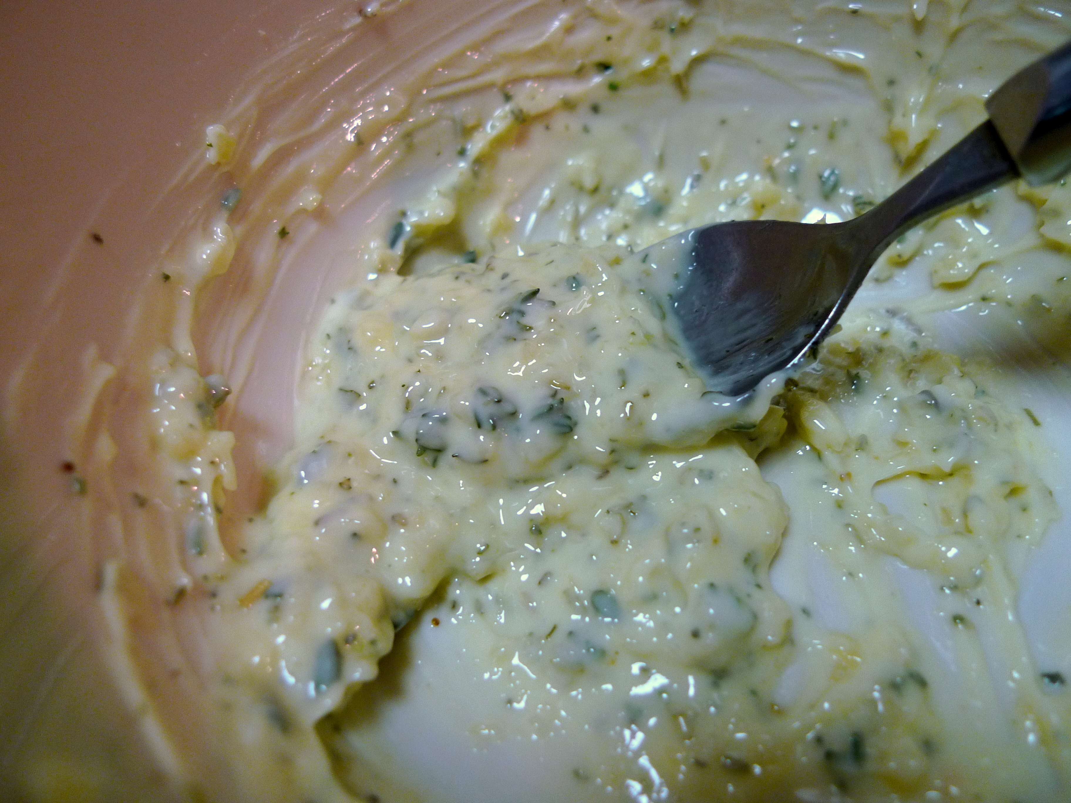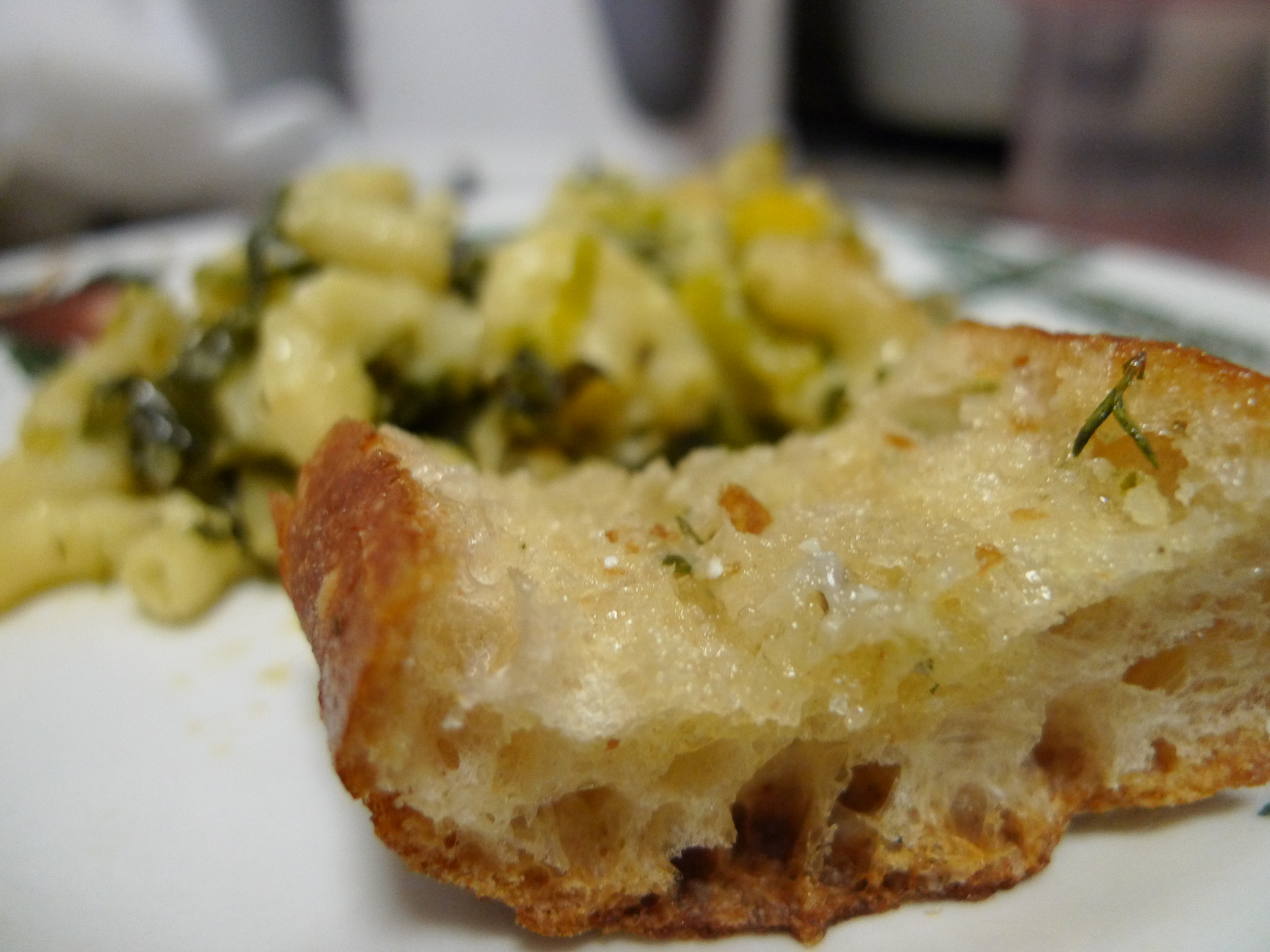 As I was cooking the Leek Tops Mac & Cheese, I wanted to try making my own garlic bread to serve with it.  Natalya has made garlic bread in the past, usually just combining crushed garlic with olive oil on bread.  I decided to fatten it up a bit with some butter and herbs because, well, fattiness is delicious!