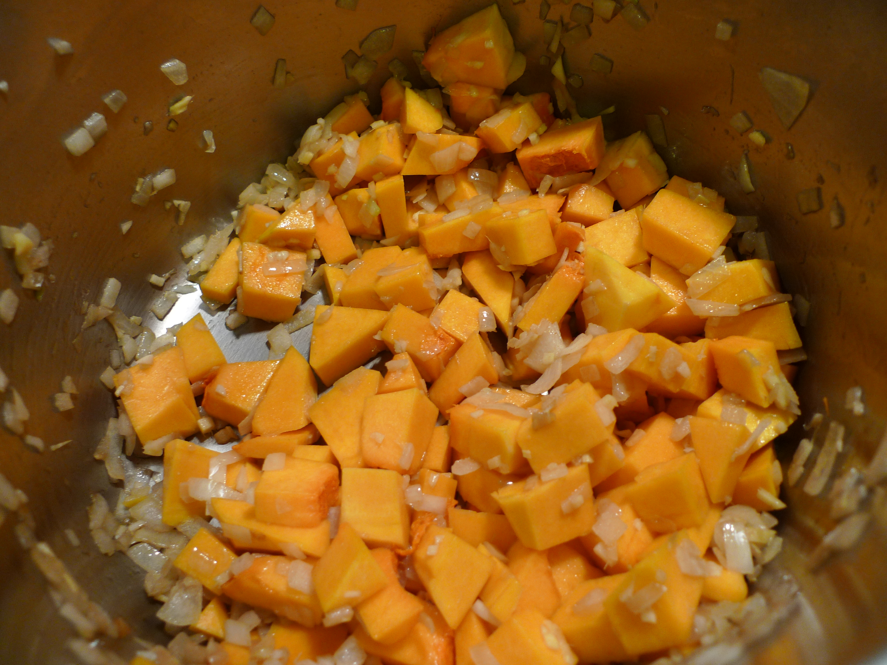 Melt butter in a large saucepan over medium heat. Cook onion until fragrant, about 2 minutes. Add ginger, garlic, and curry powder; cook, stirring occasionally, until fragrant, 6 to 8 minutes. Stir in the cubed squash.