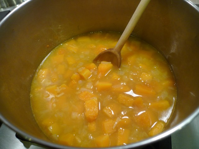 Add the stock and bring to a boil. Lower heat to a simmer and cook until squash is tender, about 15 to 20 minutes.