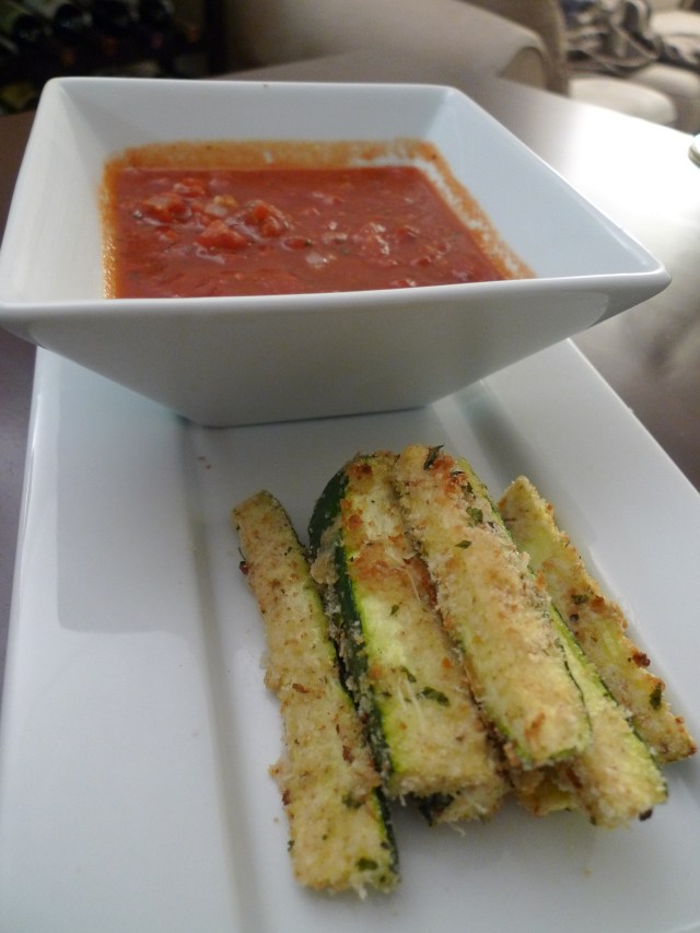 I was feeling too lazy to go to the grocery store and my fridge was empty except for one eggplant and two zucchinis.  So I headed to my favorite allrecipes.com site to see what I could whip up with this bare minimum of ingredients.  The easiest recipe I found was Eggplant Snack Sticks, which not only was super quick to prepare but healthy as well — instead of frying, you just broil the breaded vegetable sticks for a few minutes and serve with a warm marinara sauce.