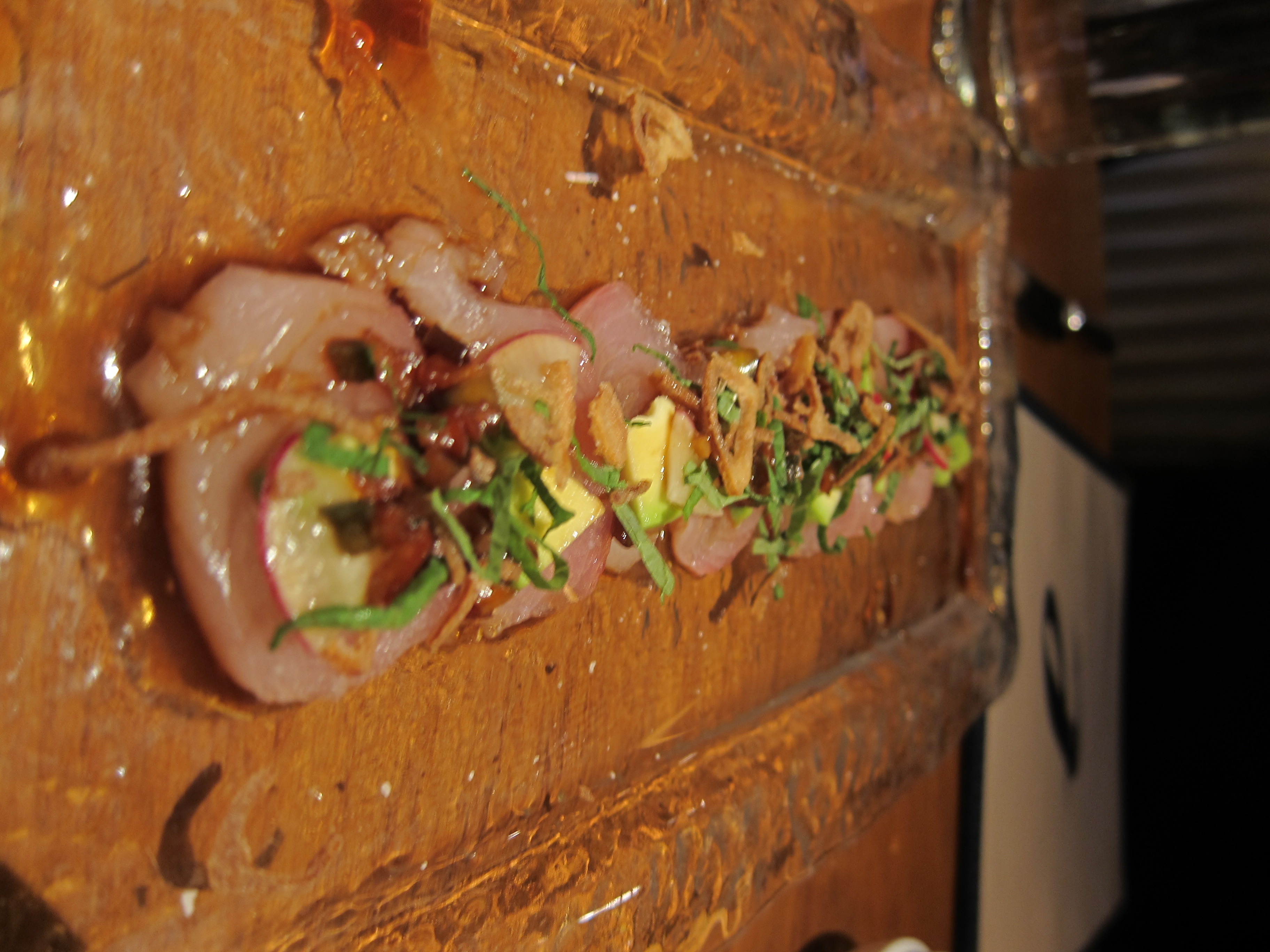 Yellowtail Carpaccio with Garlic Chili Sauce, Sesame Oil, Avocado, Crispy Shallots