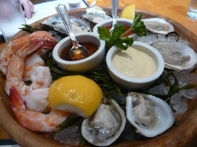 Fanny Bay, Kumamoto oysters served raw on ice with mignonette and usual accouterments and Shrimp Cocktail