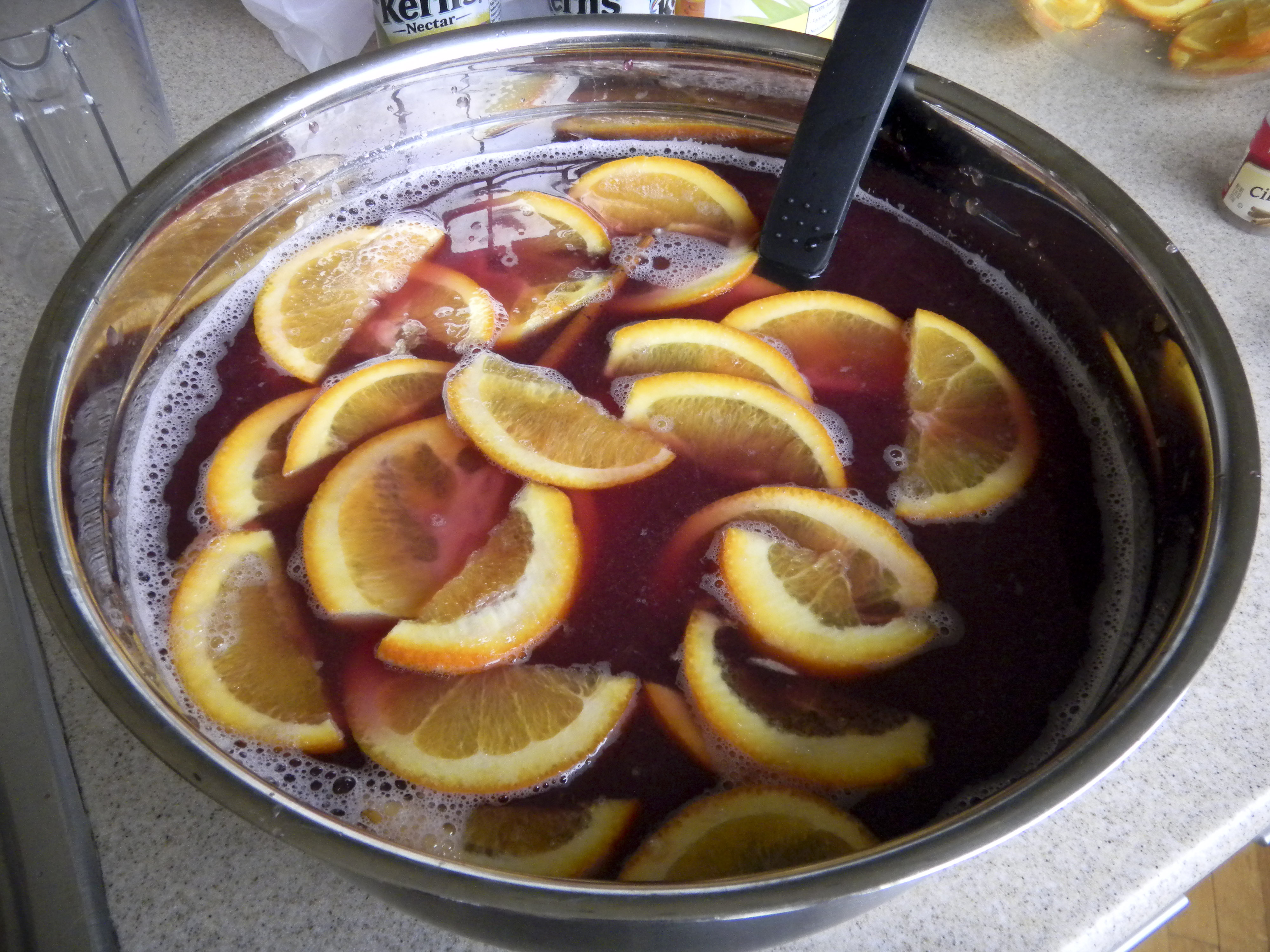 I chose to serve my sangria in a punch bowl, but you can also serve from a glass pitcher. Fill your cup with ice, fill with sangria and garnish with orange slice. Drink up!