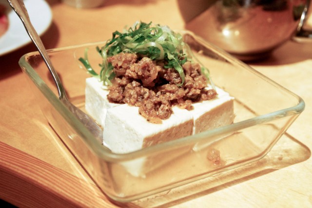 Cold tofu topped with flavored minced pork and vegetables. I think I prefer tofu warm, but the pork flavor was delicious and made a great choice for an appetizer.