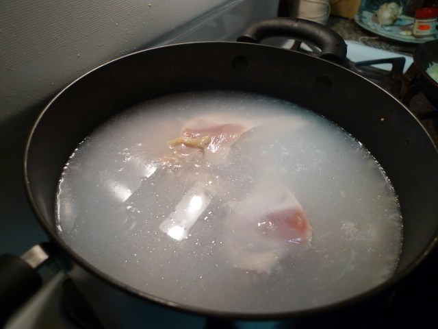 Bring a large pot of water to a boil.  Once boiling, place boneless skinless chicken breasts in the pot.  Boil until chicken is fully cooked, about 20 minutes.