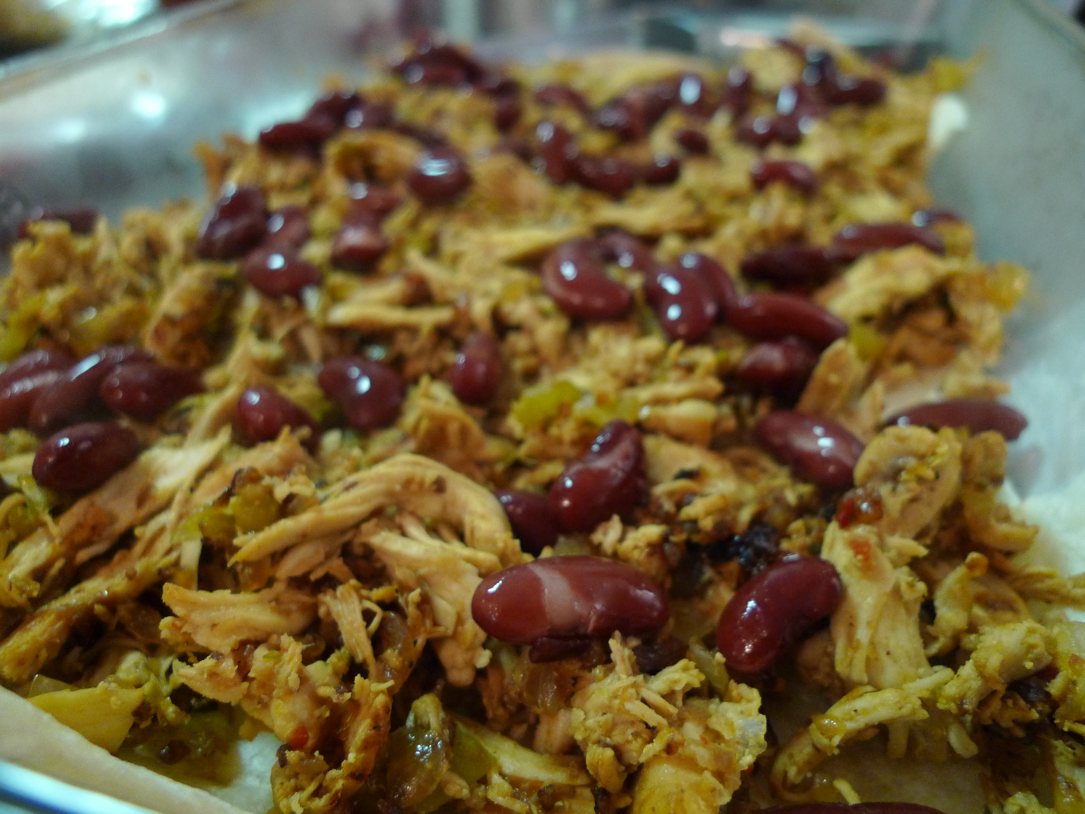 For our Gourmet Game Day,” my friend Hans made a Layered Chicken Enchilada Casserole.  It was quick and easy to prepare, and even shredding chicken was surprisingly simple.  Detailed instructions are below, but essentially all you need to do is boil chicken and then shred!  The dish was extremely flavorful with a perfect amount of spice and heat… and a bubbling cheese topping is always a welcome touch.  Some adjustments for next time: I think we will double the amount of kidney beans and add some olives and corn to the layers.  Yum!