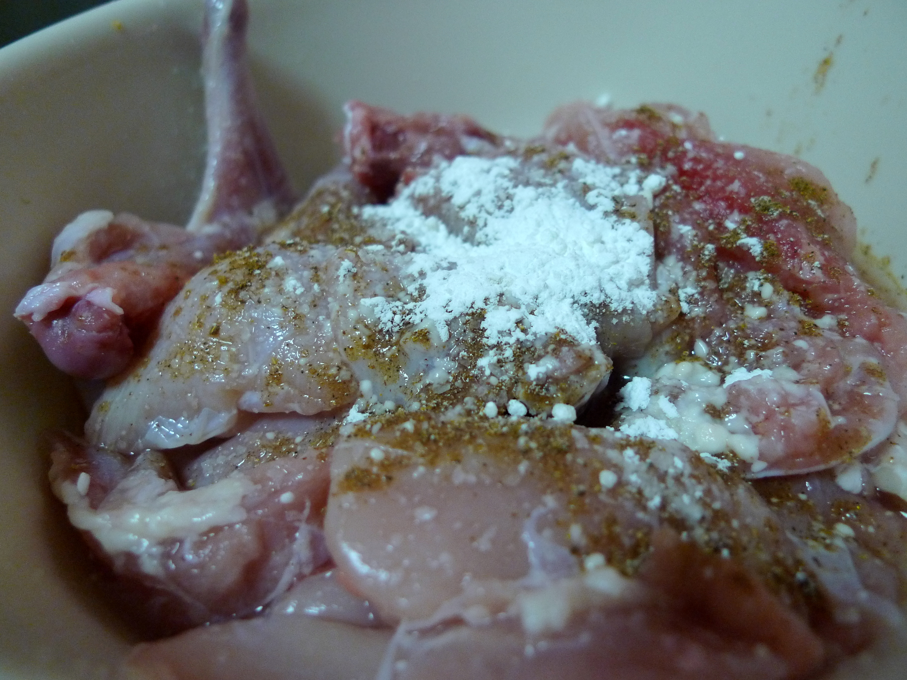 Clean the rabbit meat and cut into small cubes. Marinate in salt, Five Spice power, and cornstarch for 15mins.
