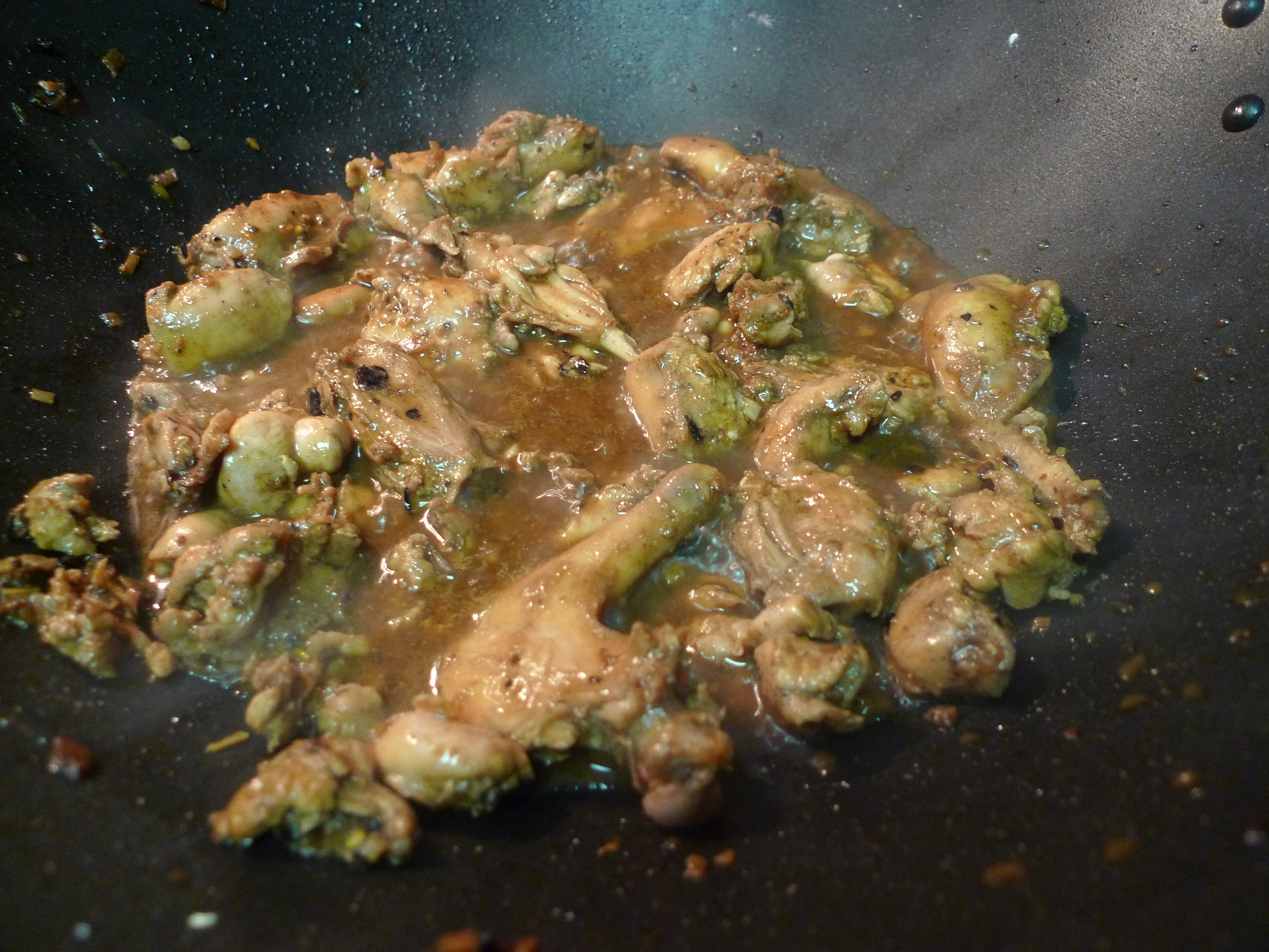 Add the rabbit meat and stir fry for a couple minutes, then lower heat and let simmer for 10 minutes. Periodically add water as necessary to keep the meat moist.