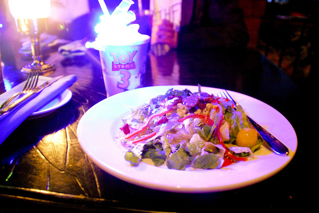 Cajun-inspired salad, and Minute Maid Light Raspberry Lemonade in a keepsake cup with glowing clip-on figurine! Mine was Buzz Lightyear.