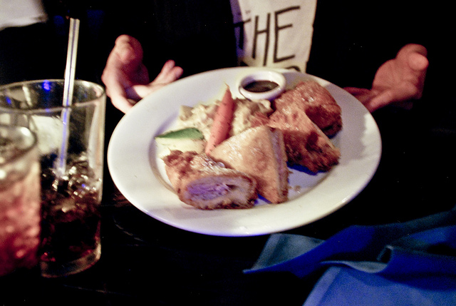 Turkey, ham, and swiss cheese in a battered egg bread, lightly fried to a golden brown. With Blue Bayou potatoes and seasonal vegetables. This was super crunchy and thick.
