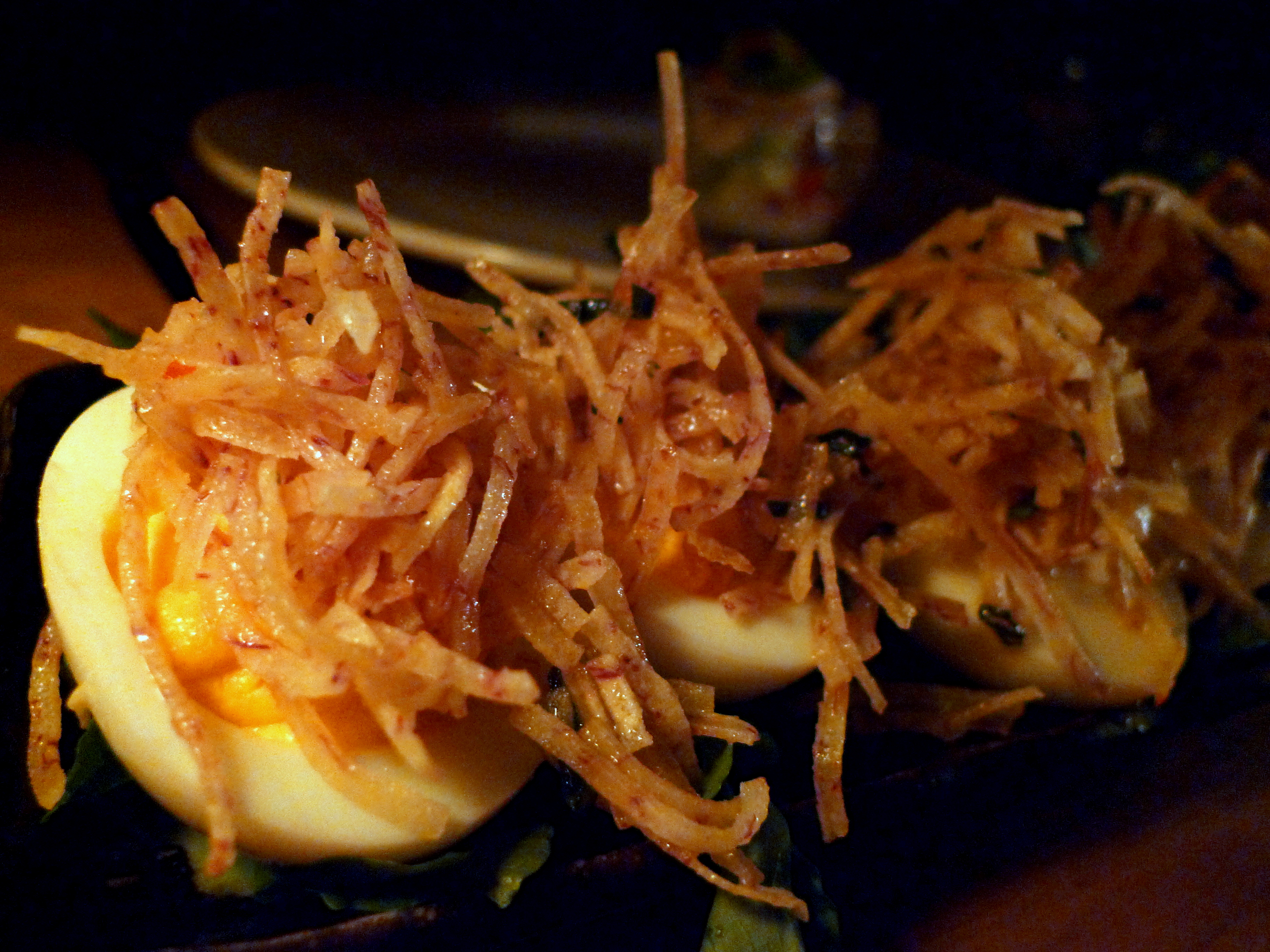 I am obsessed with these deviled eggs. Probably 85% of the reason is due to what I believe are fried taro chips on top. Creamy egg yolk with a hint of paprika and crispy taro root fries… a must order.
