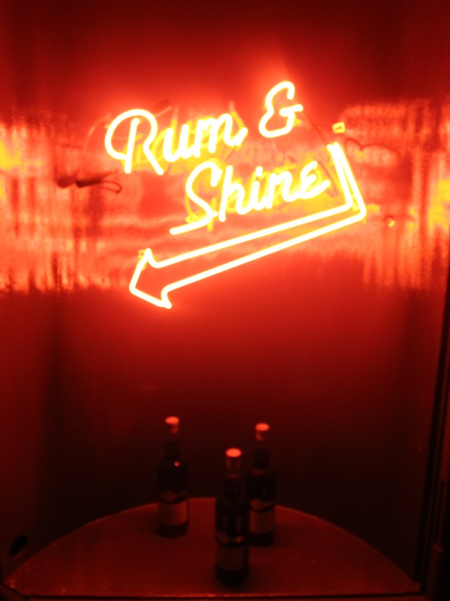 The Hurricane Club is a “modern interpretation of the tiki bar and restaurant,” which apparently necessitates an old school shoe-shine and a rum fountain right outside the ladies’ and men’s lounges. You can purchase a small 3oz bottle of rum for $4 ish (I think… unsure as we got the female 100% discount).