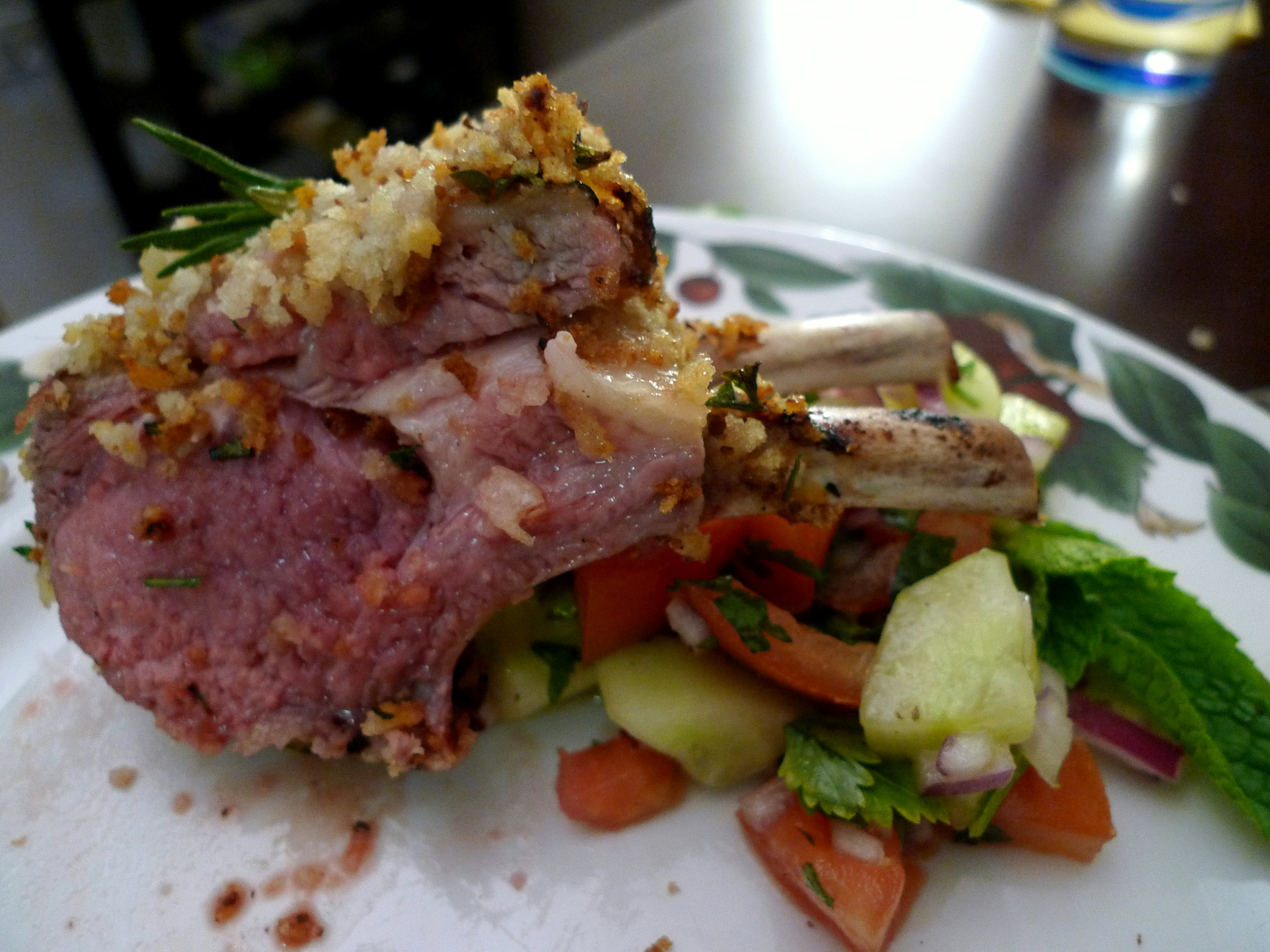 As I was preparing my Herb Crusted Rack of Lamb with a Honey Mustard Glaze, I was trying to think of a lighter side dish to serve with it. I recalled the first time I had made Baby Lamb Chops with a Cucumber-Mint Relish, I served it with a tomato, cucumber, red onion and mint salad. It was a refreshing complement to the lamb and I figured it was worth repeating. However, this time I found the proper origins of the salad in Persian cuisine. I asked our friend Roza for the recipe, and as most family recipes go, the amounts were all very arbitrary. Basically, she just said to chop some tomatoes, cucumbers, onion, and mint and toss with a lemon vinaigrette. So I attempted to measure and record the portions as I made it but of course it’s all up to personal taste!