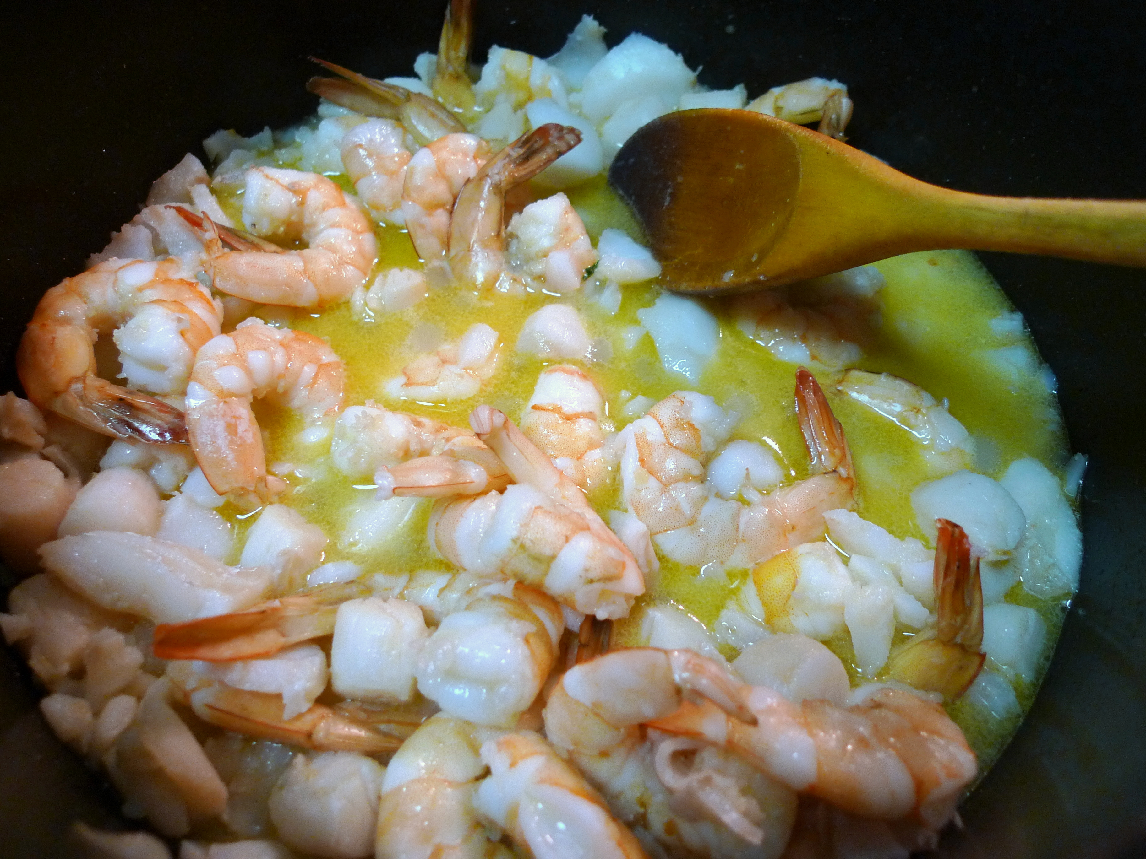 Heat remaining 1/4 C oil in a large skillet over high heat. Add garlic and cook 5 seconds. Immediately add the fish, shrimp and scallops. Sauté until just cooked through, 2-4 minutes. Gently stir into the sauce.