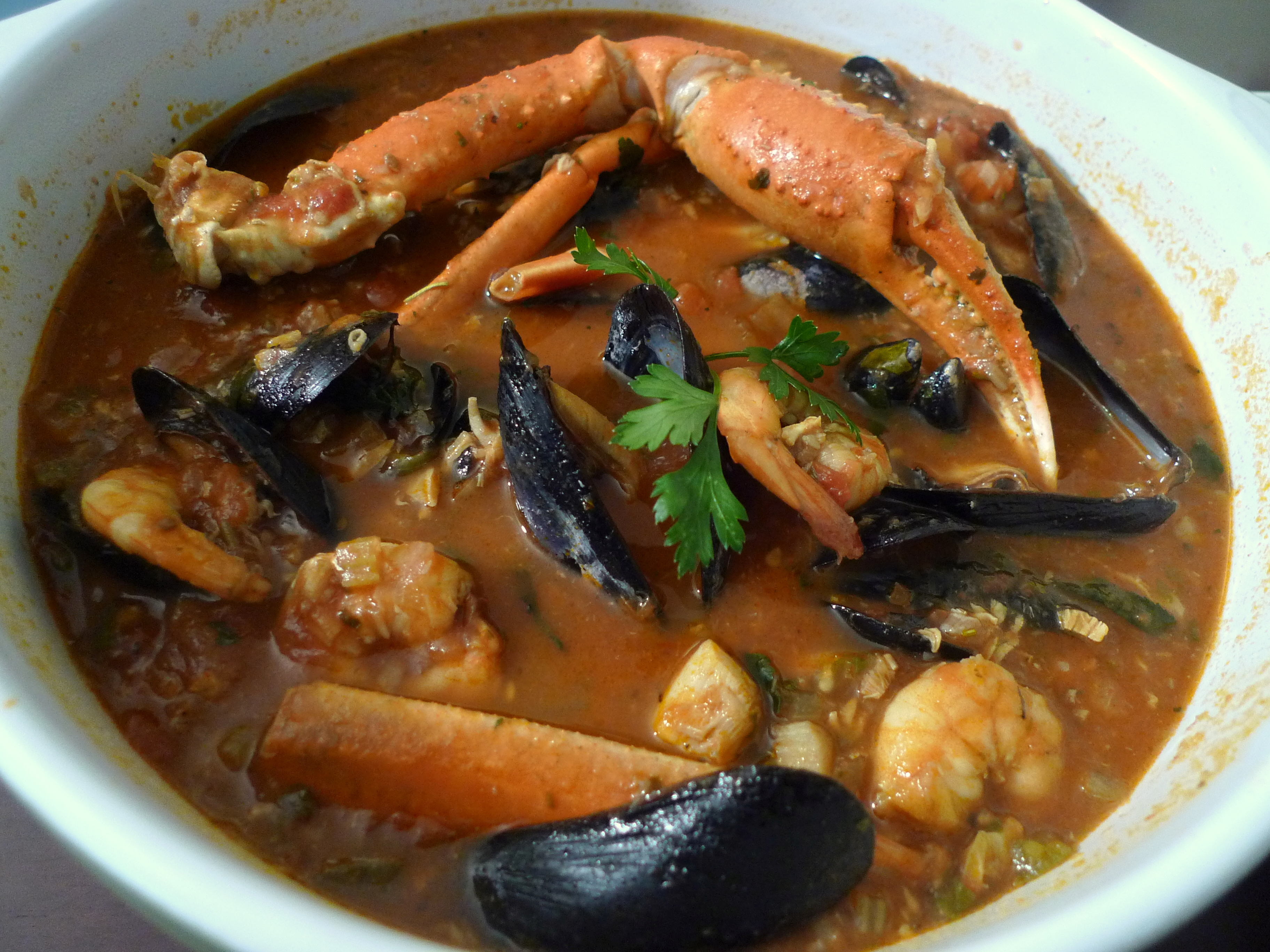 Ladle cioppino into large casserole or soup tureen or directly into shallow soup plates. Garnish with chopped Italian Parsley.