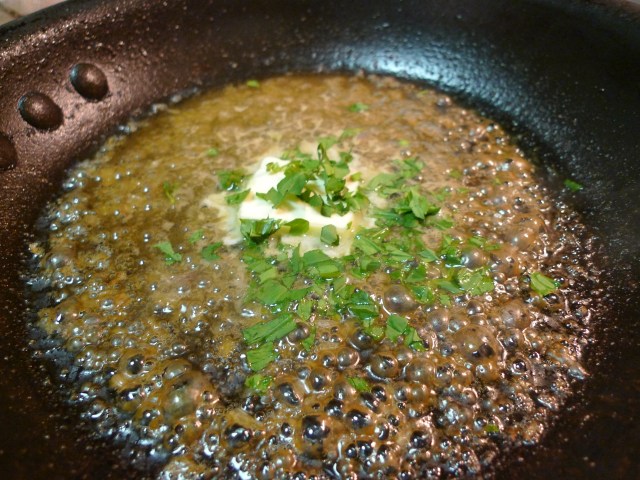 Stir in the chopped tarragon and remaining 2 T of butter, and any juices that have accumulated on the baking sheet and swirl to melt the butter. Season to taste with salt and pepper.