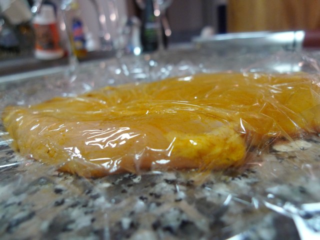 Lay 2 pieces of chicken on a large piece of plastic wrap, cover with a second piece of plastic wrap, and, using a meat pounder, pound to about 1/4 inch thick. If you don’t have a meat pounder, anything heavy with a flat surface will do the trick. I used a small skillet and gave the meat a few good whacks. It was actually quite fun!