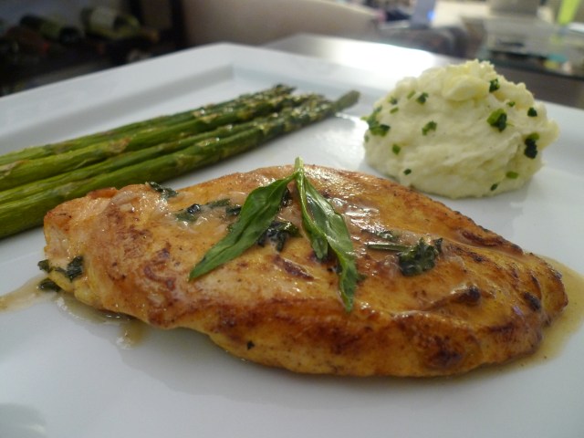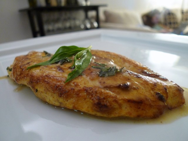 The first time I made this, I totally forgot to flatten the chicken breasts and thus when sautéing for just a couple minutes each side, the chicken breasts did not get cooked the entire way through. Thus, I had to use the oven to finish cooking the chicken breasts rather than using it solely to keep them warm… so don’t forget to flatten the chicken! There’s an actual purpose to it besides just having the dish taken up more surface area on your plate.