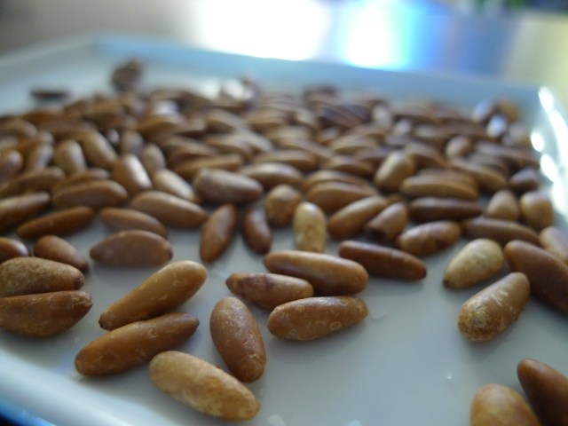 Spread the pine nuts on one of the lined pans and toast in the oven for about 10 minute, until evenly browned.  Remove from the oven, transfer to a plate, sprinkle with salt, and let cool.