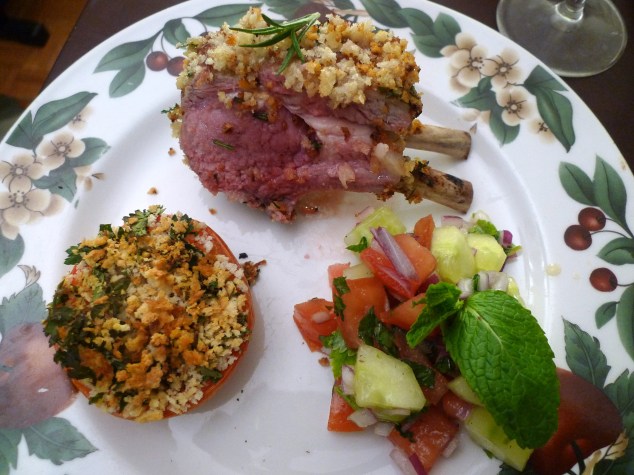 Lamb is often associated with springtime, particularly with the traditional of eating lamb for Easter. Thus, most spring vegetables are a great complement to the slightly game-y taste of lamb, such as peas, carrots, asparagus, fennel, chard, artichokes, and so on. Mint is also a popular pairing with lamb and so I tried serving this with a refreshing Salad Shirazi, which is a traditional Persian salad of tomatoes, cucumber, onions, and mint (very similar to the salad I made last time with my Baby Lamb Chops with Cucumber-Mint Relish expect now I found the formal name!). I also served these lamb chops with Provençal Roast Tomatoes, although perhaps it was too much in terms of bread crumbs. Caramelized Carrots, Potato Gratin, Braised Endive, and Roasted Asparagus are also great sides for this dish.