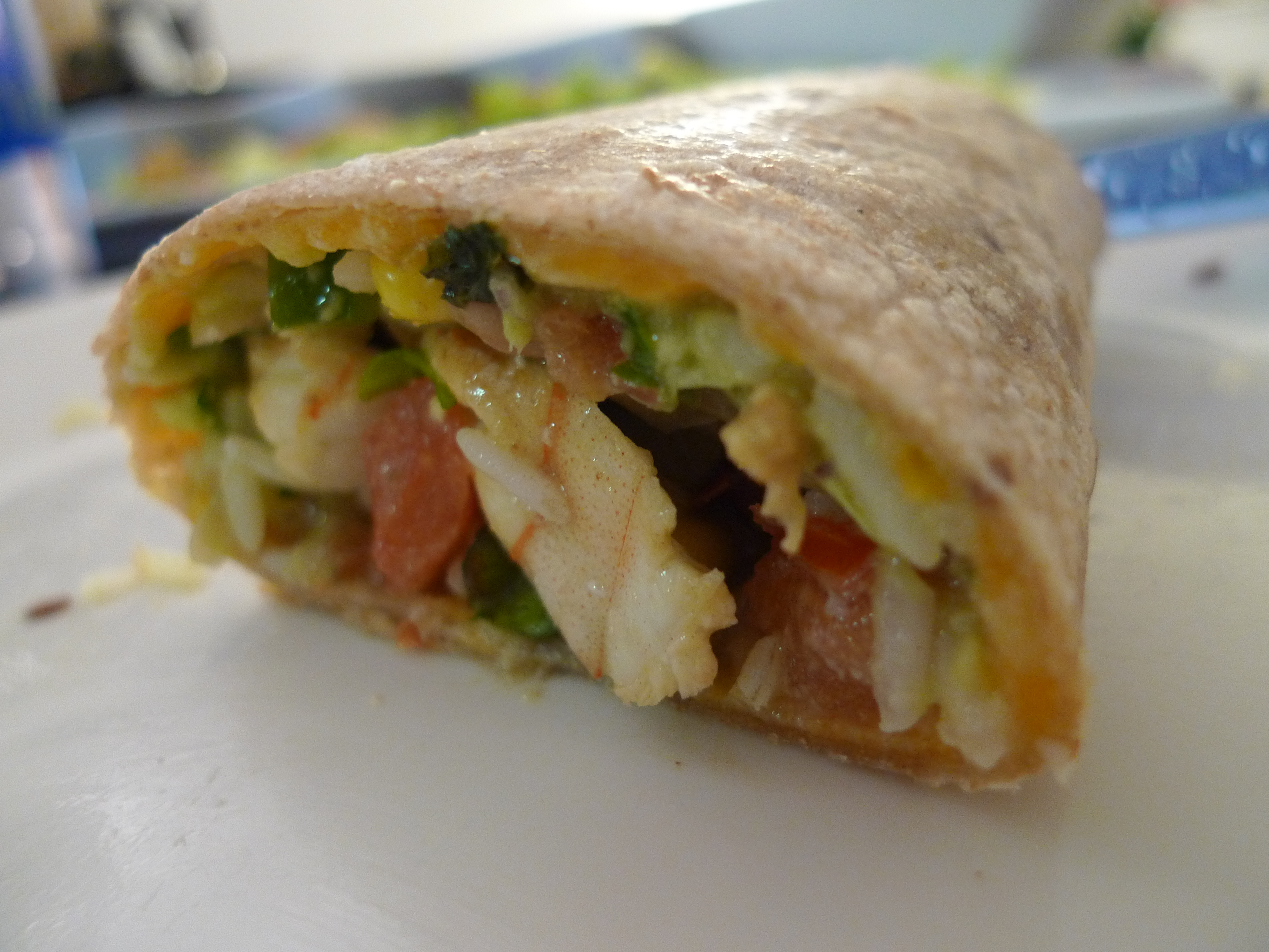 Spread some guacamole over the tortilla, then add the salsa, rice, lettuce, and shrimp. Top with sour cream.