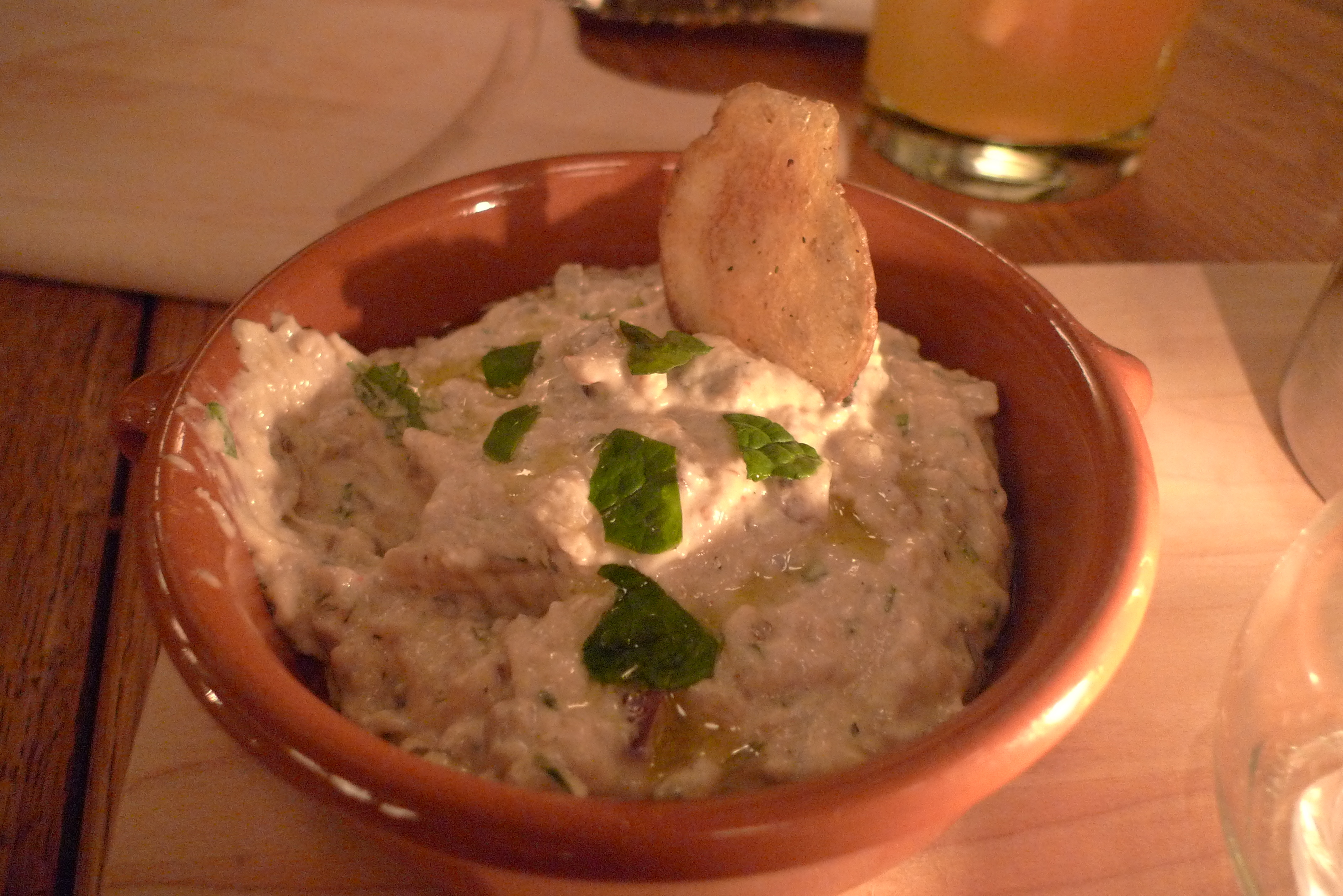 This smoky and creamy eggplant dip reminded me of a combination of baba ghanoush and cream cheese… so good! Served with thin salted crisps made of fingerling potatoes