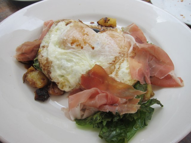 Balsamic fried eggs, greens, organic potato & garlic hash, sliced Parma prosciutto