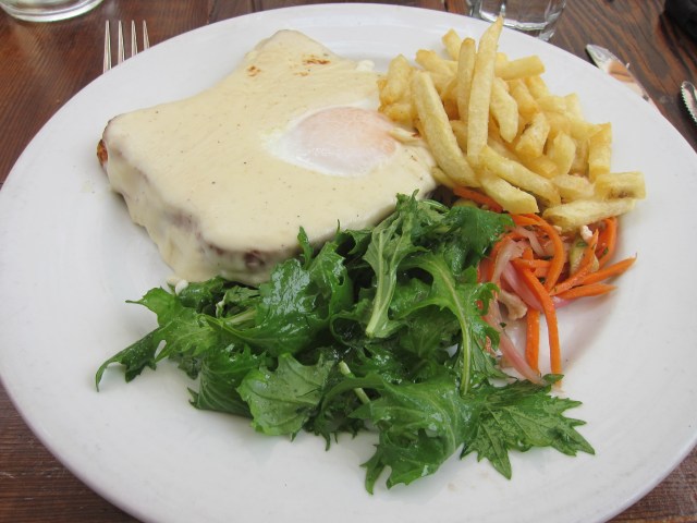 Croque Madame: toasted ham & Gruyere, crowned with an egg and béchamel, French fries, small salad