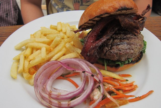 Cinema’s house ground hamburger, organic Acme bun, grilled onions, tangy spiced mayo (slow cooked, brown sugar smoked bacon added separately)